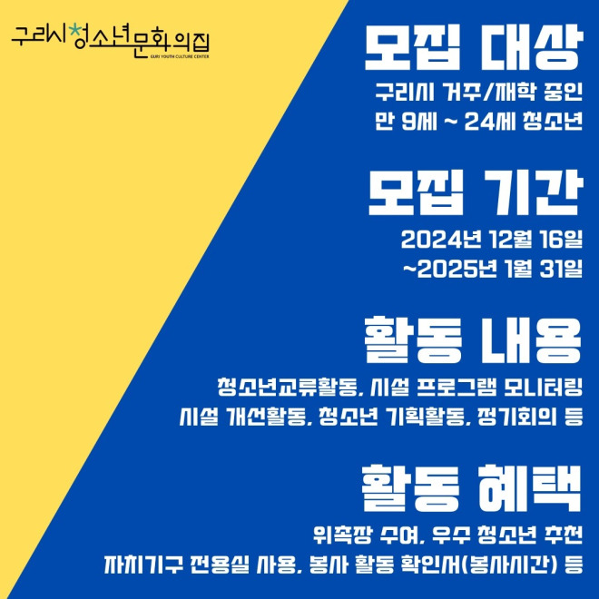 청소년문화의집 [모집] 구리시청소년문화의집 '제2기 청소년운영위원회 별하 신규위원' 모집 작성자 김진수 등록일자 2024년 12월 30일 10시 50분 34초 조회 431 신청서 작성 링크 바로가기: https://naver.me/GFBnktox 001.jpg [ Size : 123.03KB , Down : 329 ] 미리보기 다운로드 002.jpg [ Size : 109.39KB , Down : 323 ] 미리보기 다운로드 003.jpg [ Size : 91.77KB , Down : 327 ] 미리보기 다운로드 목록보기