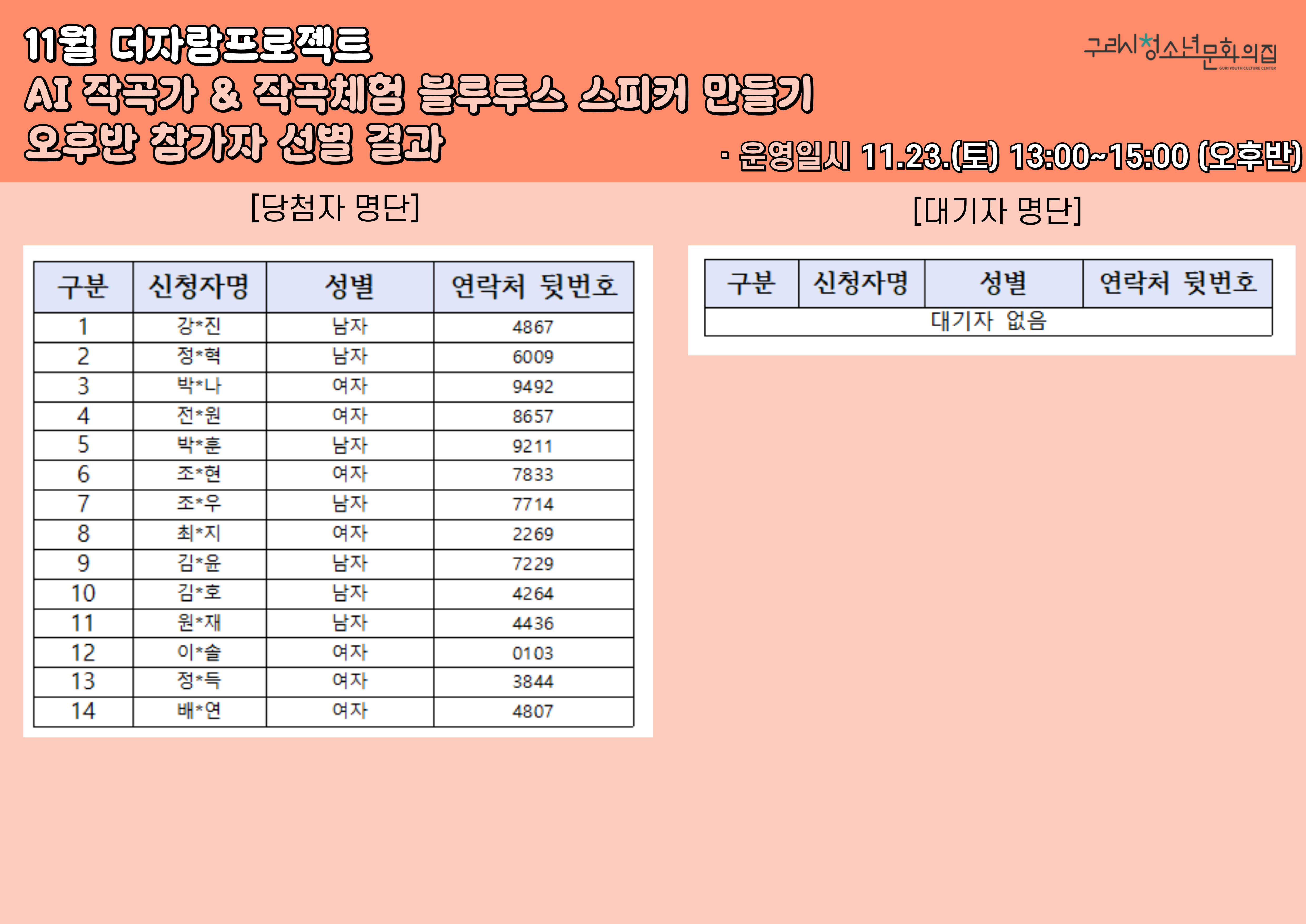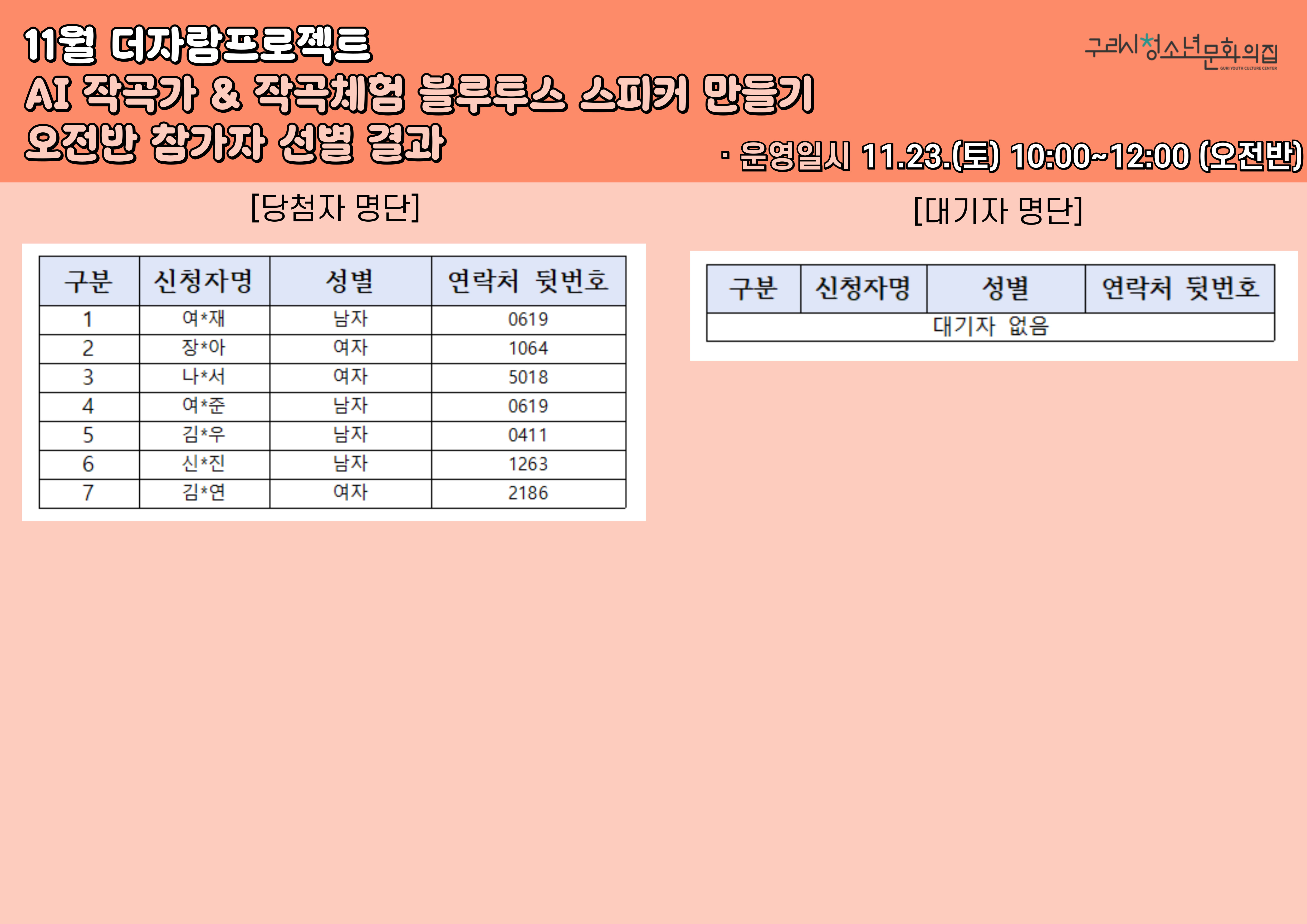 청소년문화의집 더자람프로젝트 AI작곡가 & 블루투스 스피커 만들기 오전반, 오후반 참가자 선정 결과
