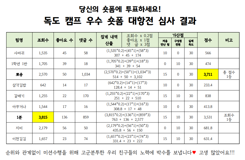 최종 1위를 한 [뽀숑] 팀과, 조회수 1위를 한 [1분] 팀에게는 약속한 선물 보내드릴게요 >_<