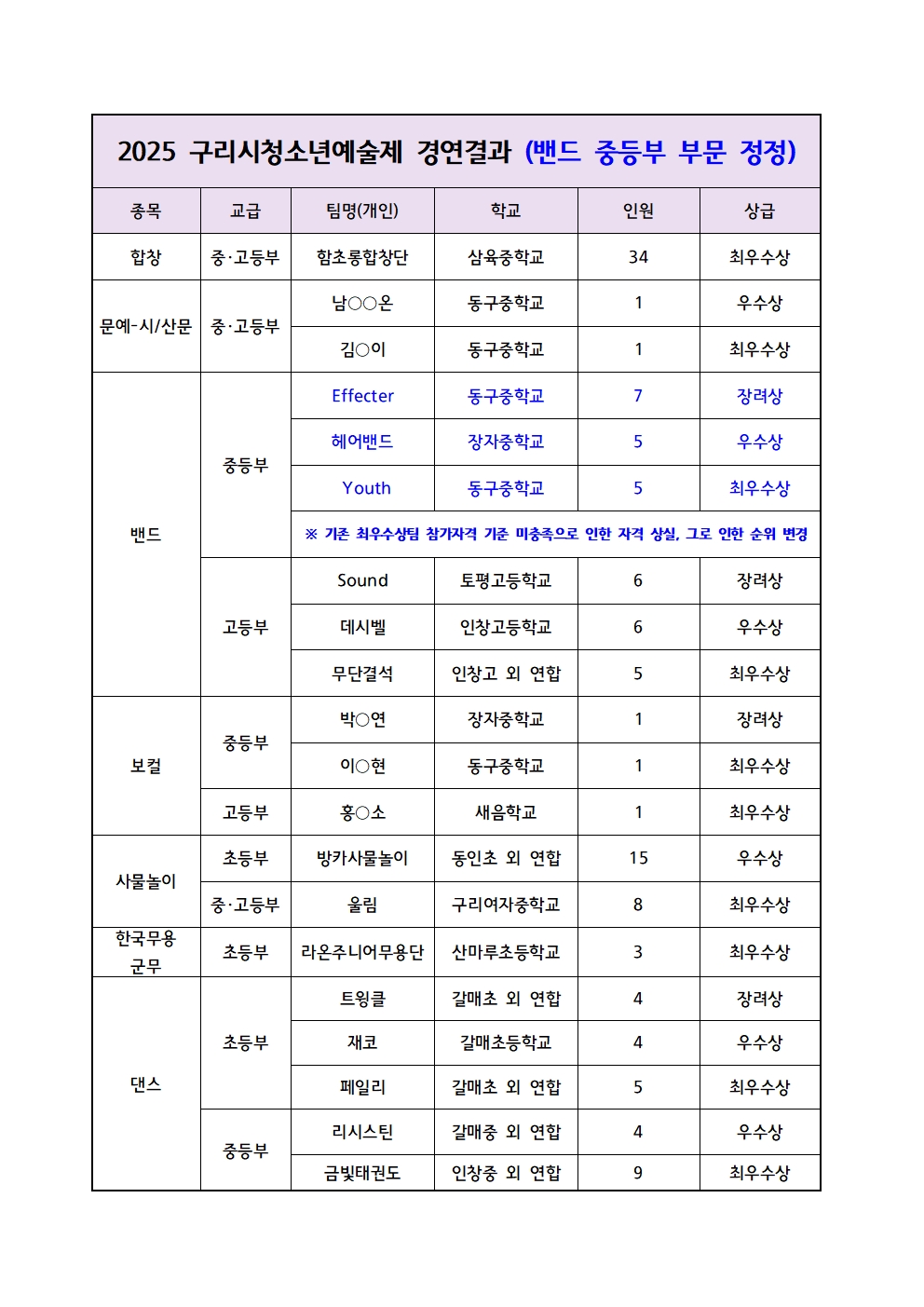 2025 구리시청소년예술제 수상 결과 밴드 부문 정정에 대해 공지 드립니다.