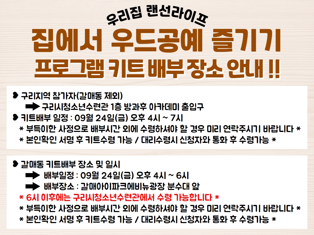 갈매지역 참가자의 경우 6시 이후에는 구리시청소년수련관 방문 후 키트 수령이 가능합니다.
