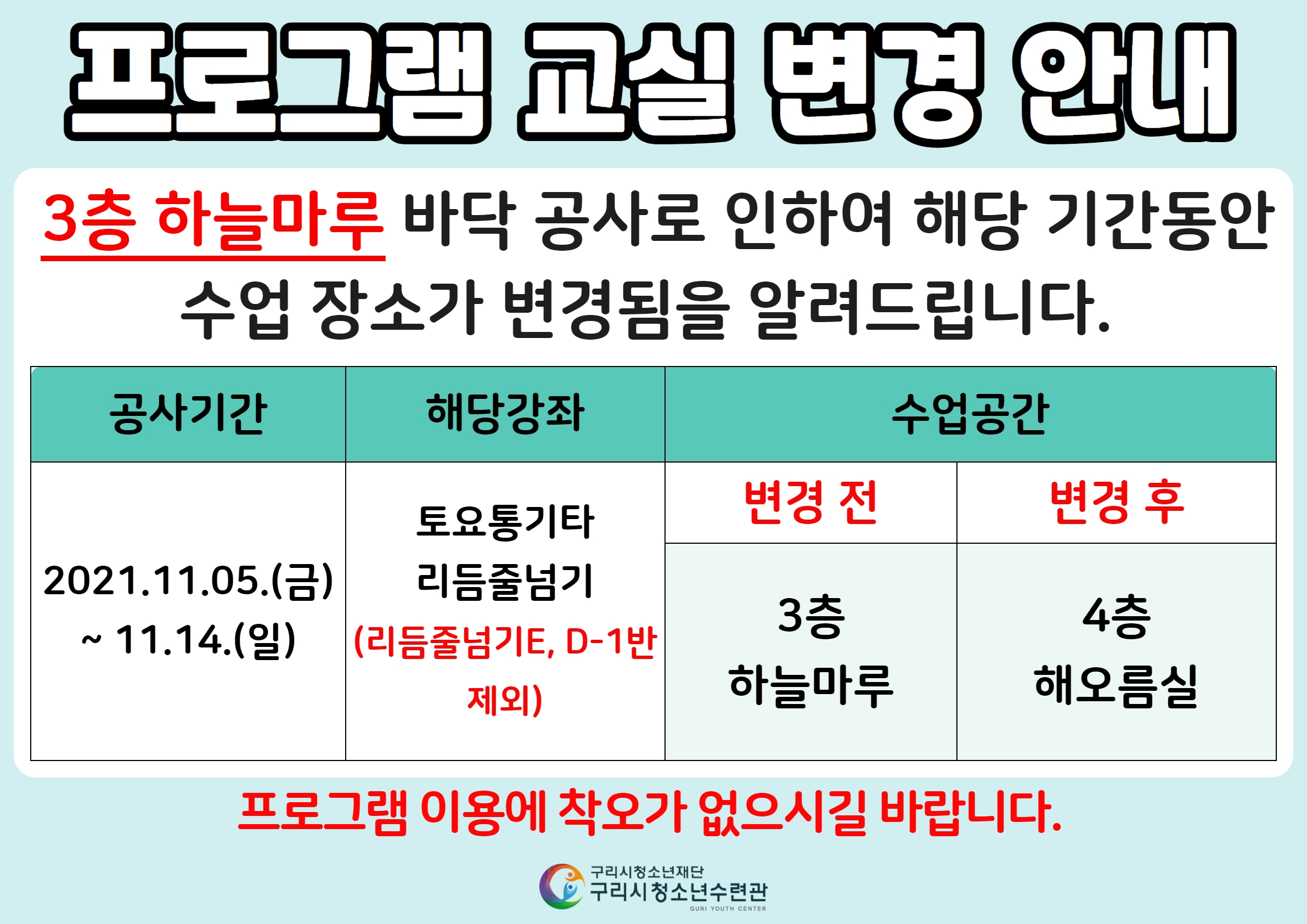 청소년수련관 프로그램 수업 장소 변경 안내 작성자 관리자 등록일자 2021년 11월 1일 17시 57분 34초 조회 1,067 문화강좌홍보.jpg [ Size : 710.2KB , Down : 823 ] 미리보기 다운로드 목록보기