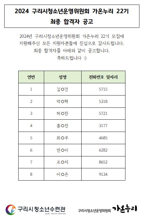 청소년수련관 구리시청소년운영위원회 가온누리 22기 최종합격자 공고 작성자 김재희 등록일자 2024년 4월 2일 9시 53분 46초 조회 417 가온누리 합격자 공고.JPG [ Size : 48.48KB , Down : 240 ] 미리보기 다운로드 목록보기