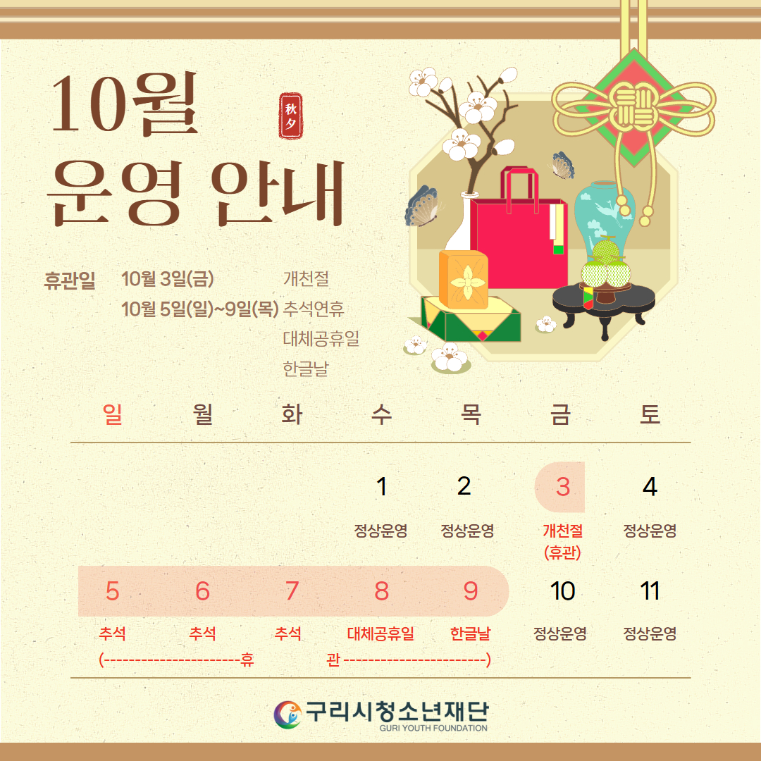 청소년수련관 2025년 10월 추석연휴 휴관 일정 안내 작성자 문서정 등록일자 2025년 9월 17일 15시 35분 5초 조회 642 10월 휴관 안내.jpg [ Size : 1.42MB , Down : 760 ] 미리보기 다운로드 목록보기