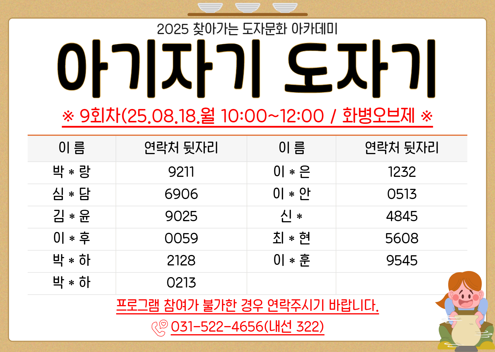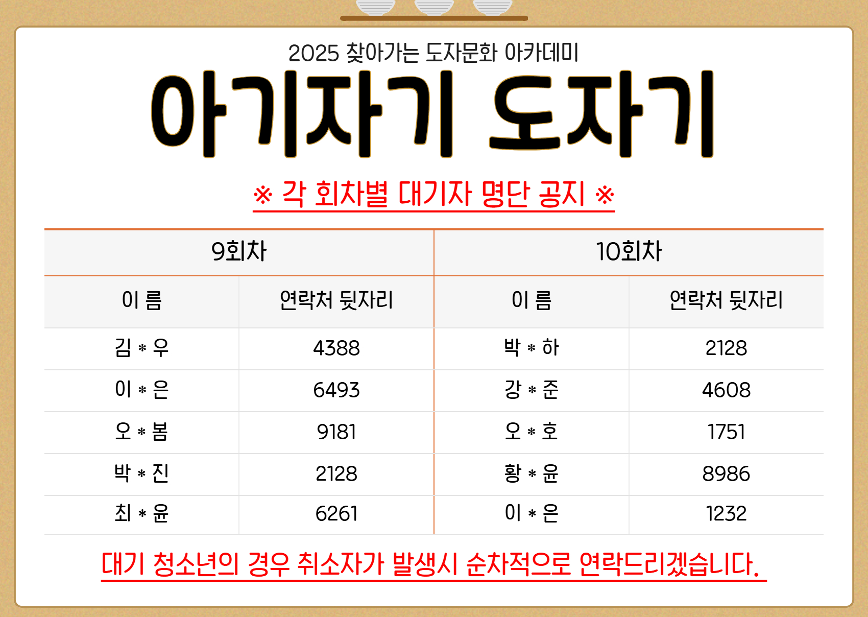 청소년문화의집 2025 아기자기 도자기 9,10회차 참가자 모집 추첨 결과 및 대기자 명단