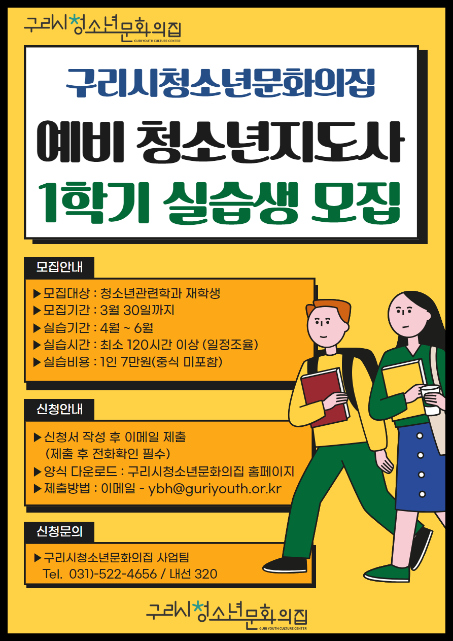 청소년문화의집 예비청소년지도사 현장실습 - 1학기 실습생 모집 안내 작성자 유병흔 등록일자 2025년 3월 13일 14시 2분 6초 조회 864 양식-현장실습 신청서.hwp [ Size : 36.5KB , Down : 229 ] 다운로드 실습생 모집 (1).jpg [ Size : 642.5KB , Down : 1,082 ] 미리보기 다운로드 목록보기