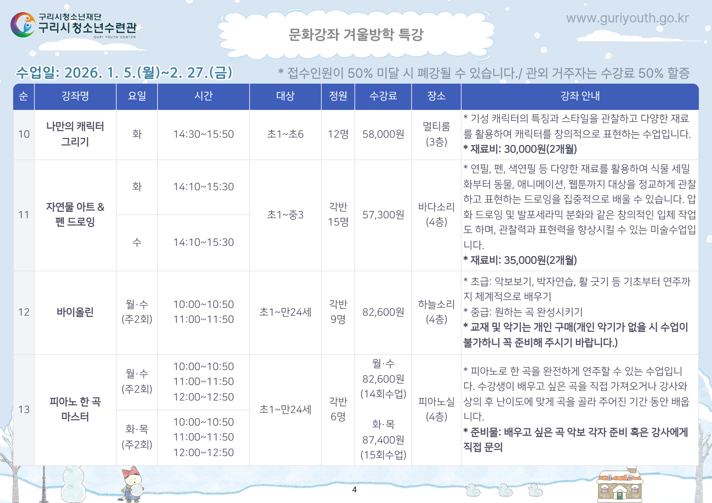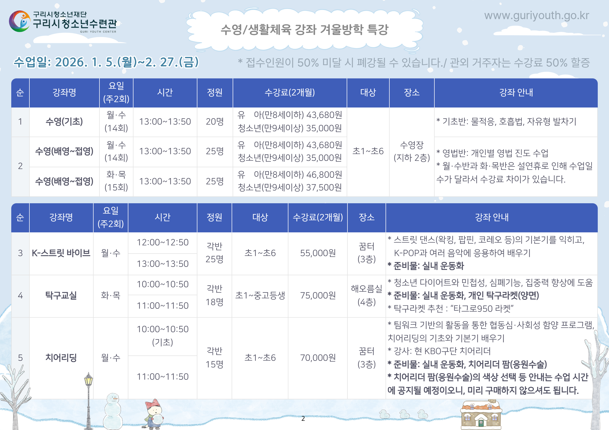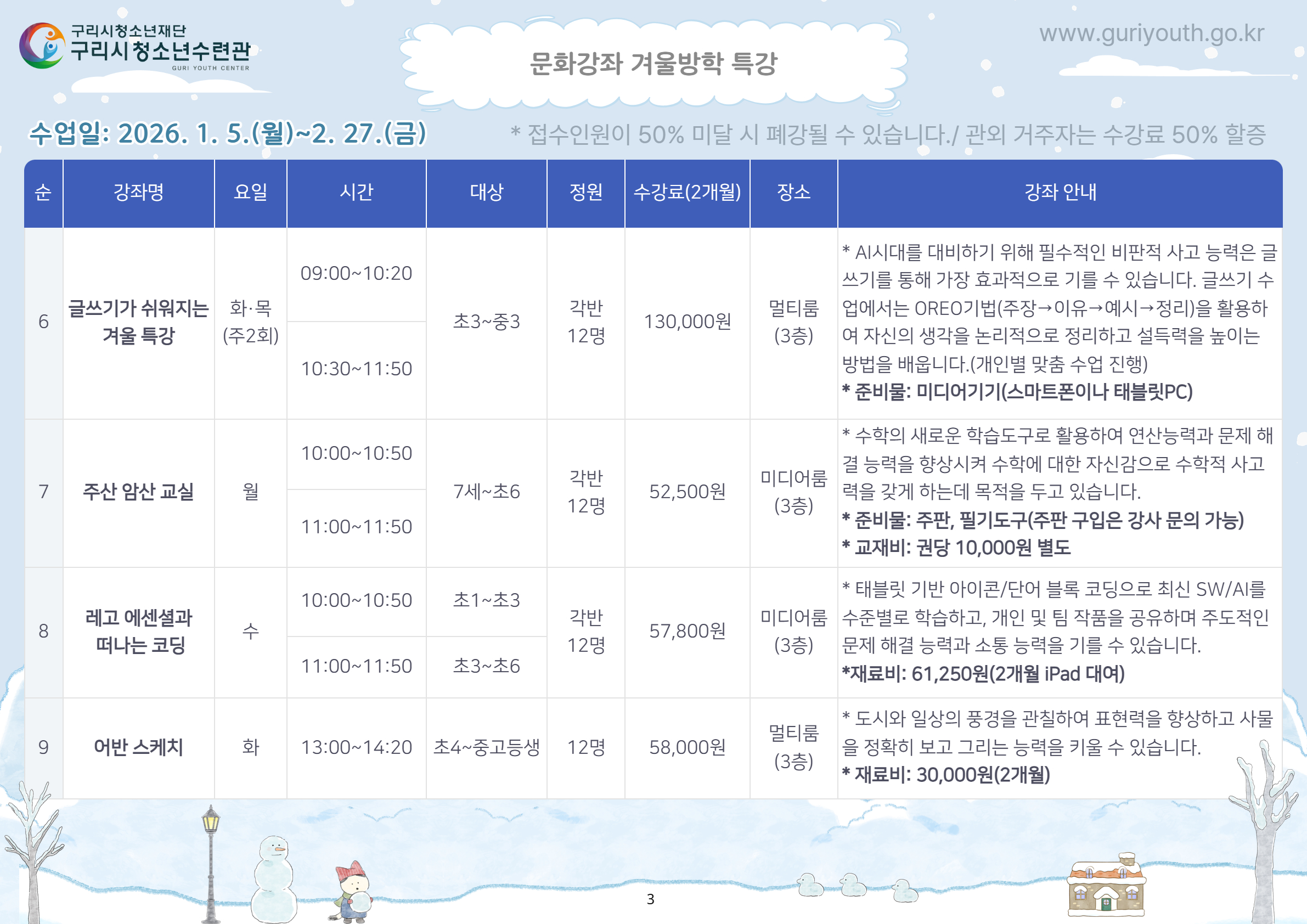 안녕하세요. 구리시청소년수련관에서 마련한 2026년 1월~2월 겨울방학특강을 안내해 드립니다.