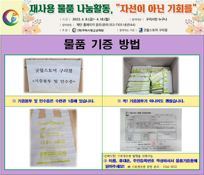 구리시청소년재단에서는 굿윌스토어 구리점과 함께 04.08.(금)부터 04.18(월)까지 “재사용 물품 나눔활동”을 진행합니다.