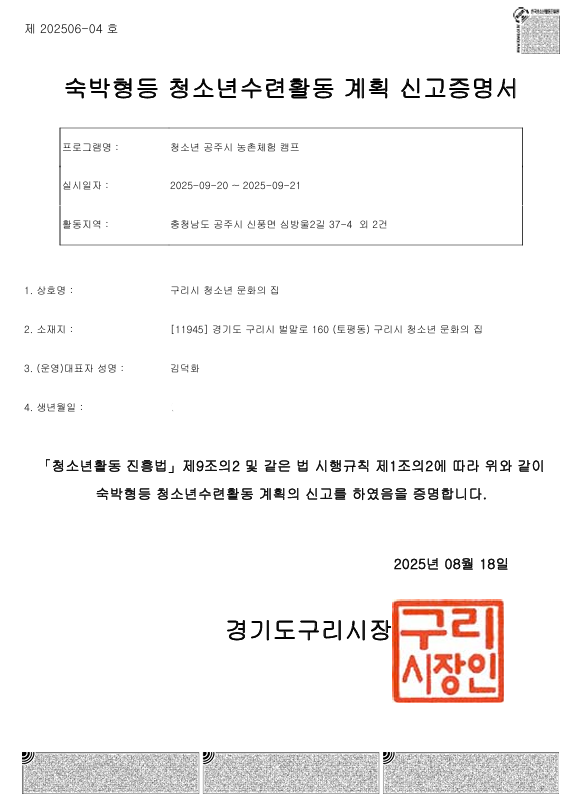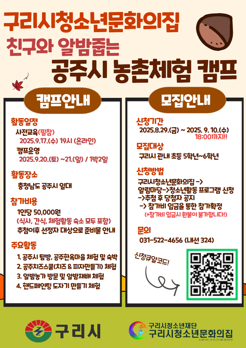 청소년문화의집 2025년 청소년 공주시 농촌체험 캠프 안내