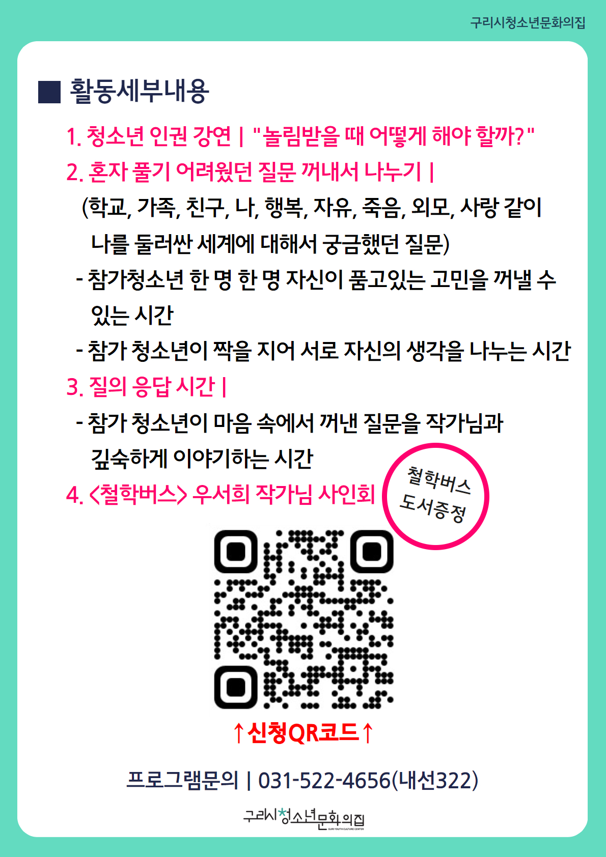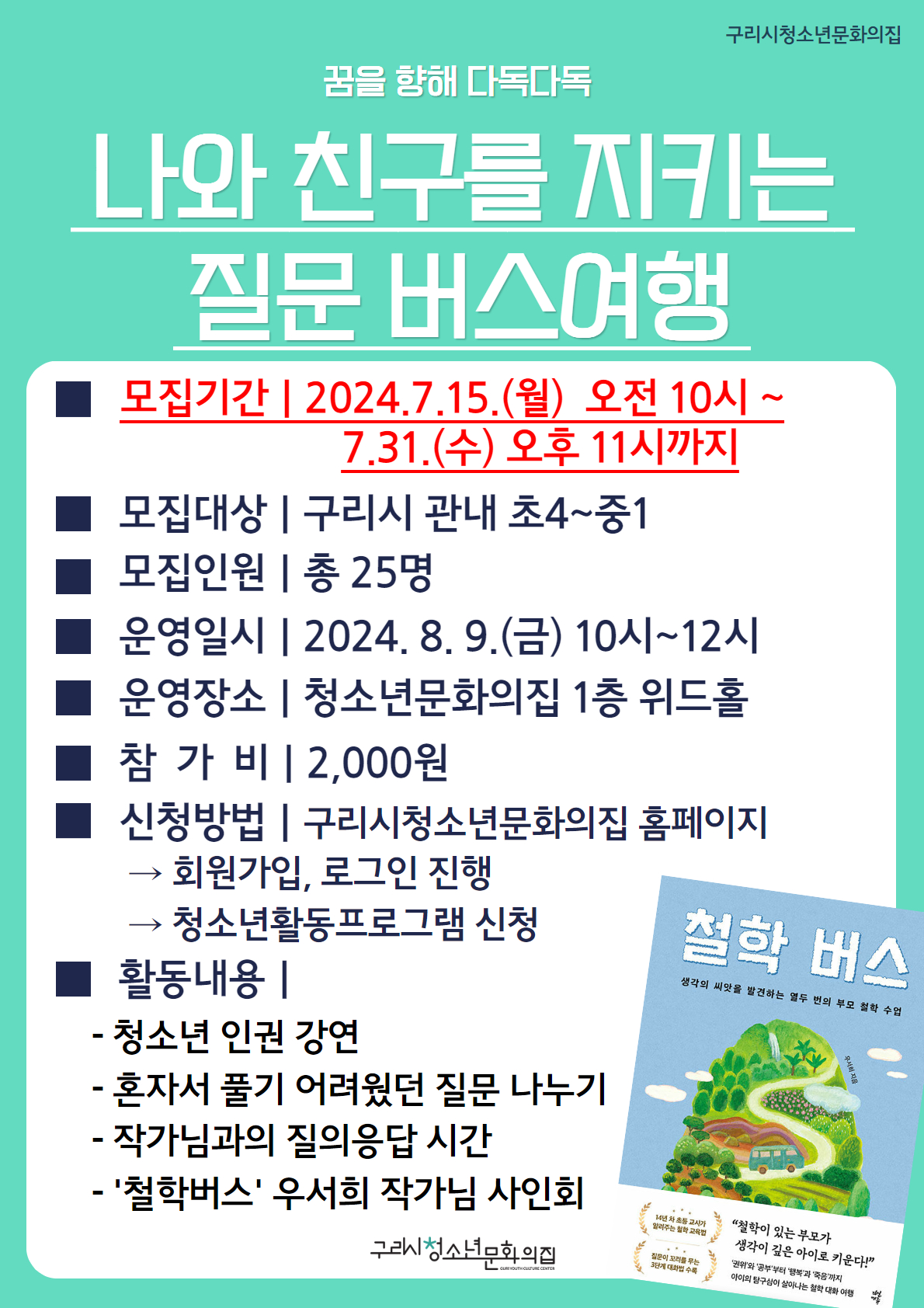 청소년문화의집 청소년문화의집 "꿈을 향해 다독다독 - 나와 친구를 지키는 질문 버스여행" 작성자 김윤지 등록일자 2024년 7월 10일 15시 54분 25초 조회 440 북콘서트 3.jpg [ Size : 1MB , Down : 374 ] 미리보기 다운로드 북콘서트 4.jpg [ Size : 829.73KB , Down : 371 ] 미리보기 다운로드 목록보기
