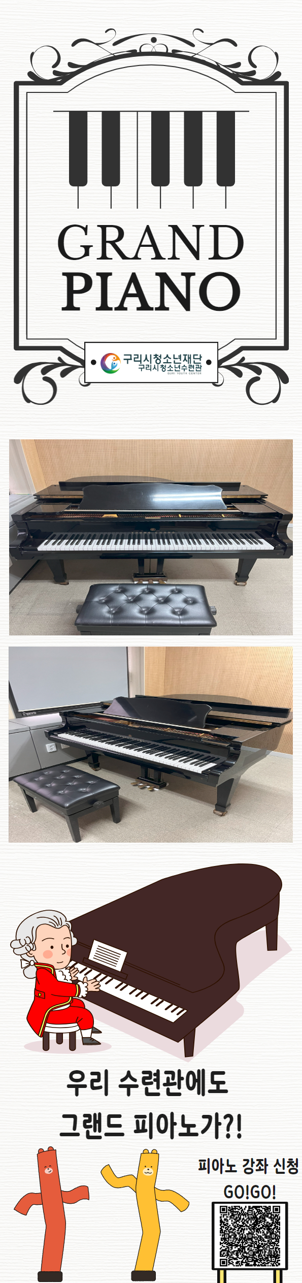 피아노 강좌 수강 시 청소년들이 기존 업라이트 피아노 뿐만 아니라 그랜드 피아노를 통해 더 다양한 곡을 연주할 수 있도록 피아노 강의실에 '그랜드 피아노'를 새로 설치했습니다!^^