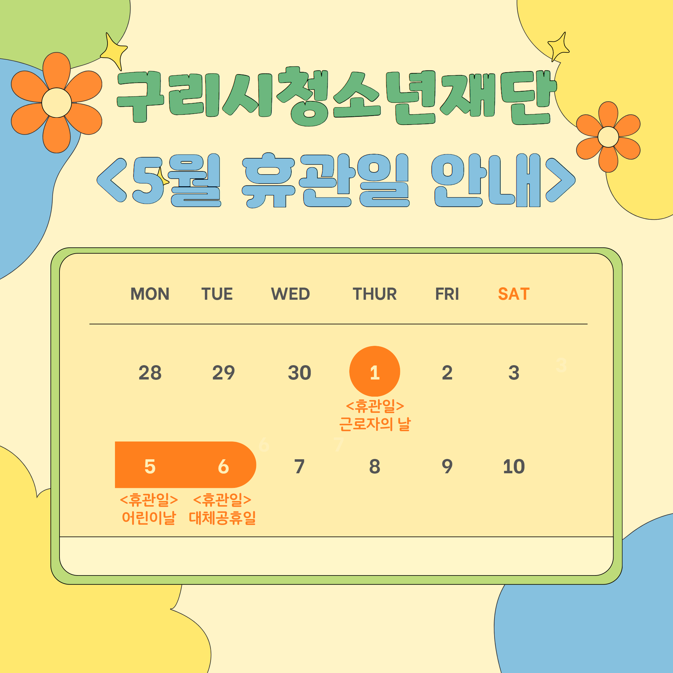 청소년수련관 2025년 5월 휴관일 안내-5/1(목), 5/5(월), 5/6(화) 작성자 문신자 등록일자 2025년 4월 14일 14시 55분 9초 조회 284 <2025년 5월 휴관일 안내>아래 날짜는 휴관일이오니, 이용에 차질 없으시기 바랍니다.- 5월 1일(목) 근로자의 날- 5월 5일(월) 어린이날- 5월 6일(화) 대체공휴일 5월 휴관 안내 (2).jpg [ Size : 866.64KB , Down : 214 ] 미리보기 다운로드 목록보기