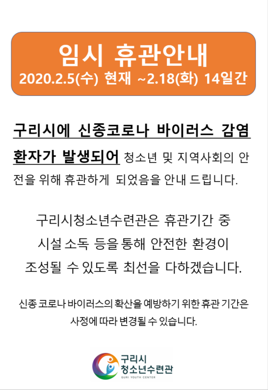청소년 및 지역사회의 안전을 위해 휴관하게 되었음을 안내드립니다.