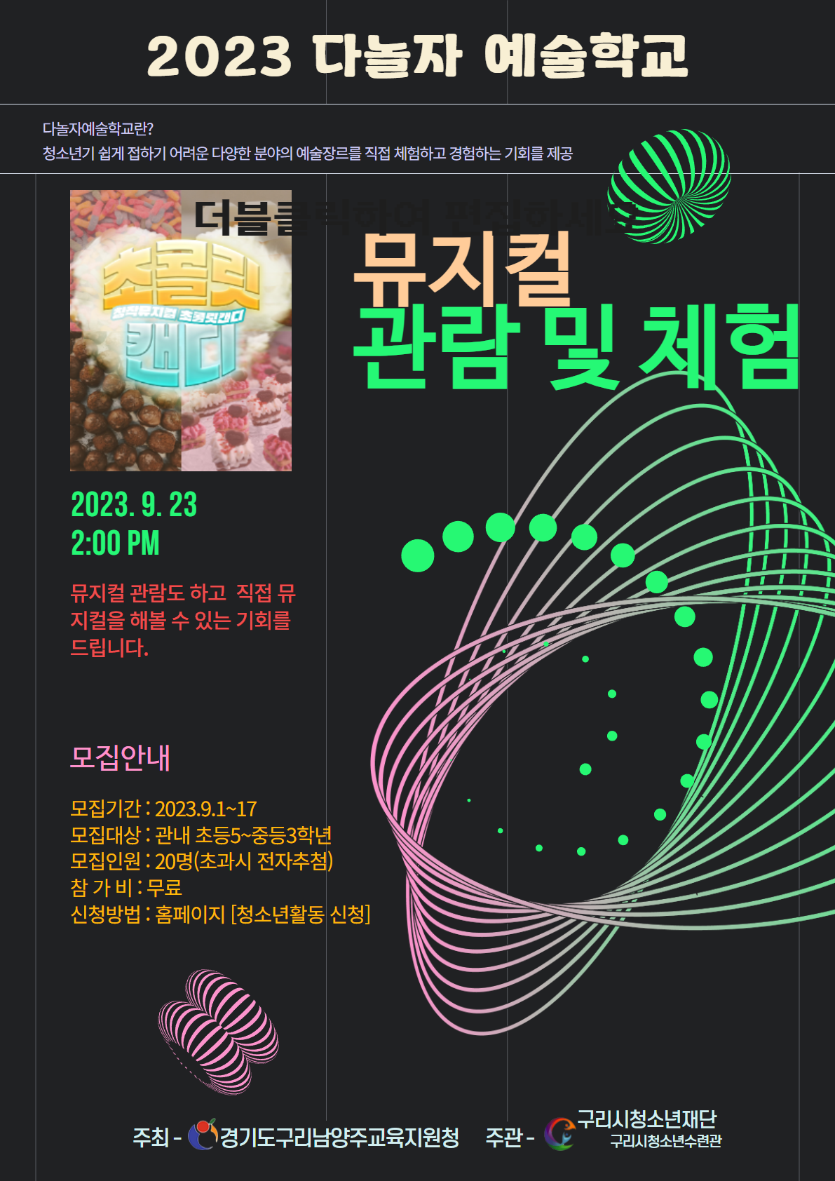 청소년수련관 2023 주말방학 방과후학교 - 다놀자 예술학교[뮤지컬] 참가자 모집 안내