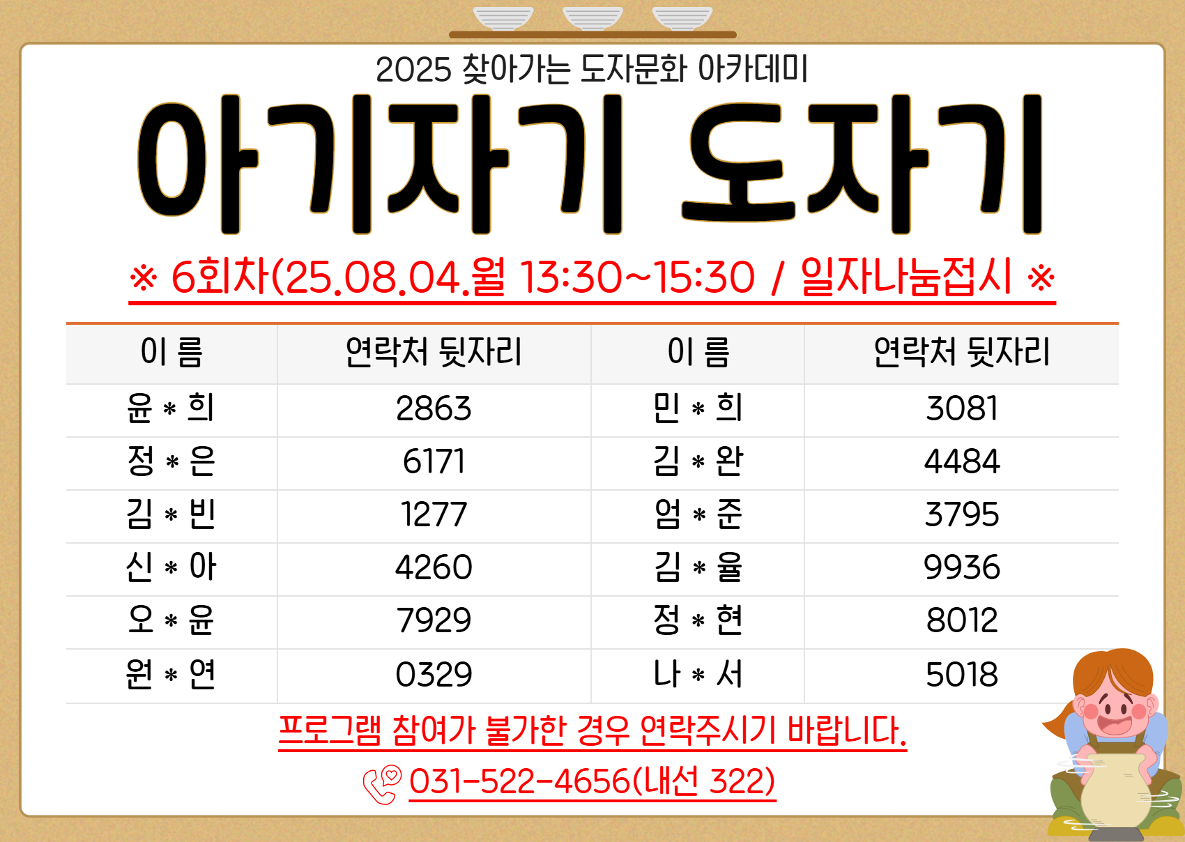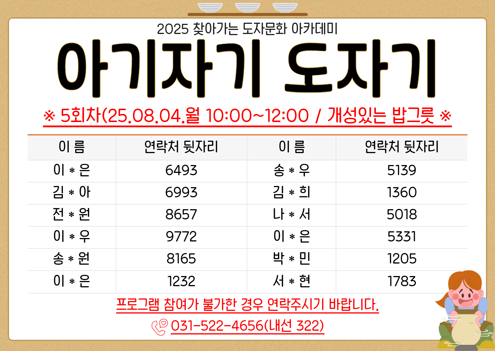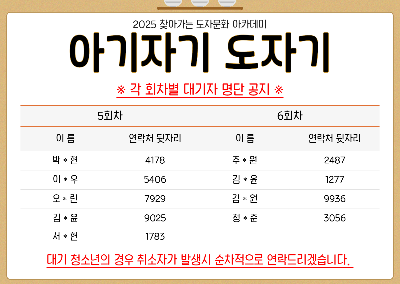 청소년문화의집 [공지] 2025 아기자기 도자기 5,6회차 참가자 모집 추첨 결과 및 대기자 명단