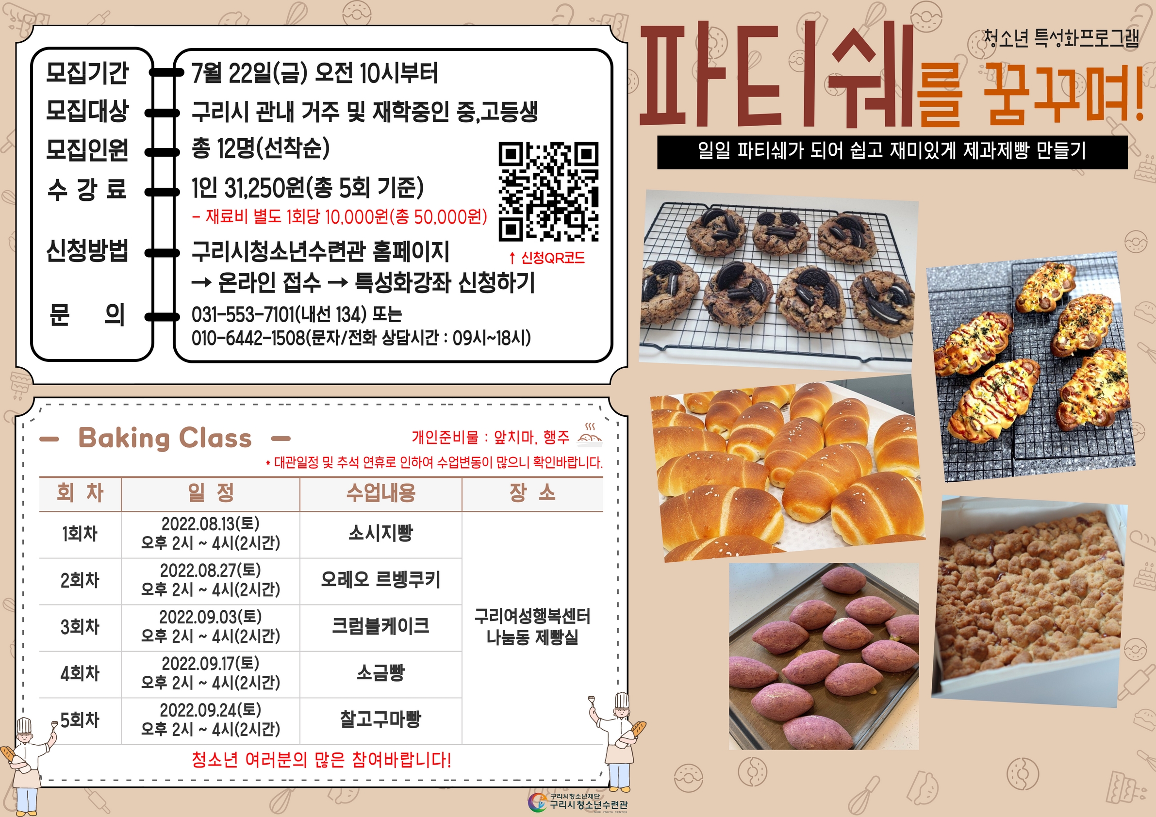 - 신청방법 : 구리시청소년수련관 홈페이지 -> 온라인접수 -> 특성화강좌 -> '파티쉐를 꿈꾸며' 신청하기
