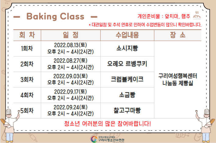 - 수업장소 : 구리여성행복센터 나눔동 3층 제빵실