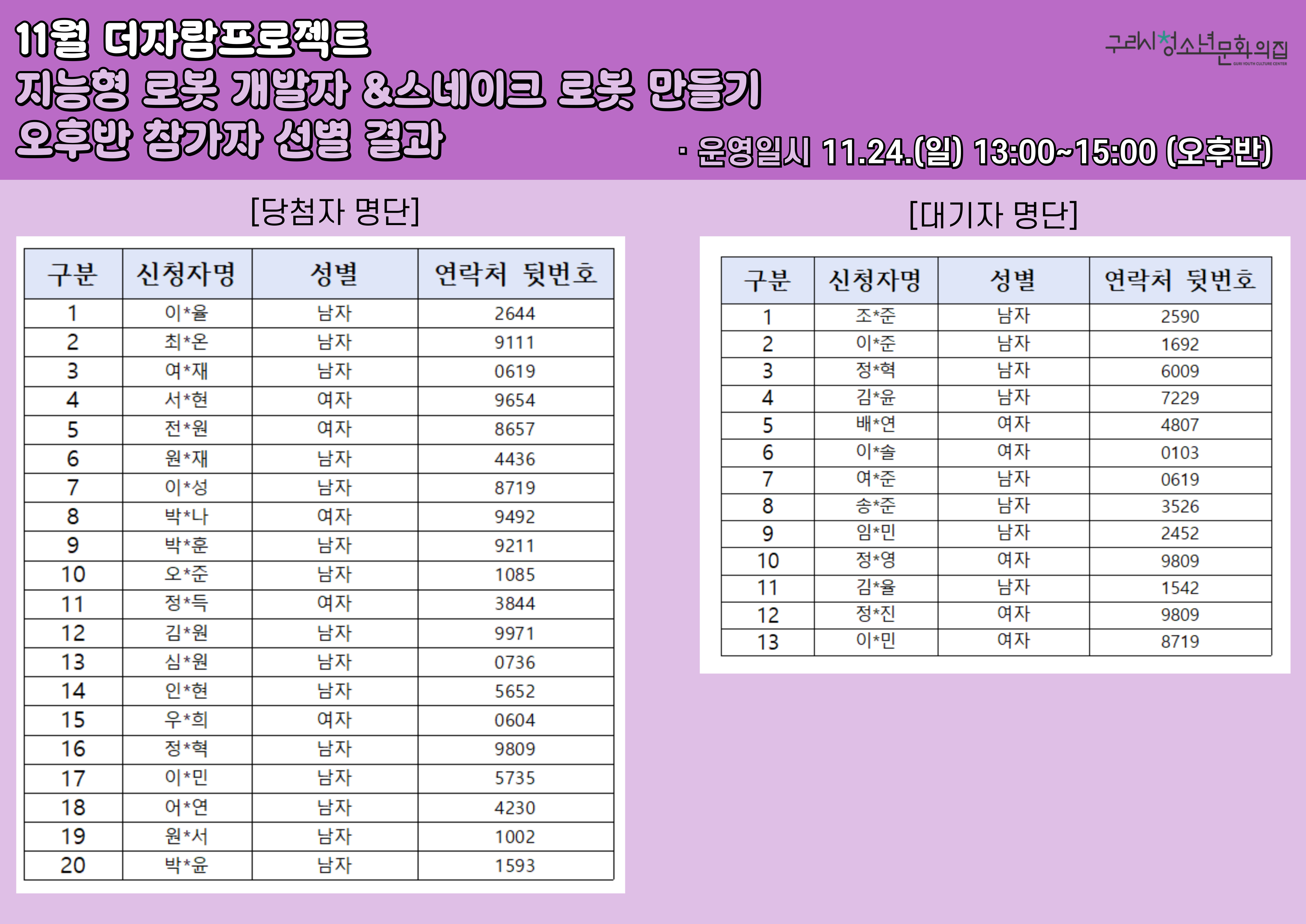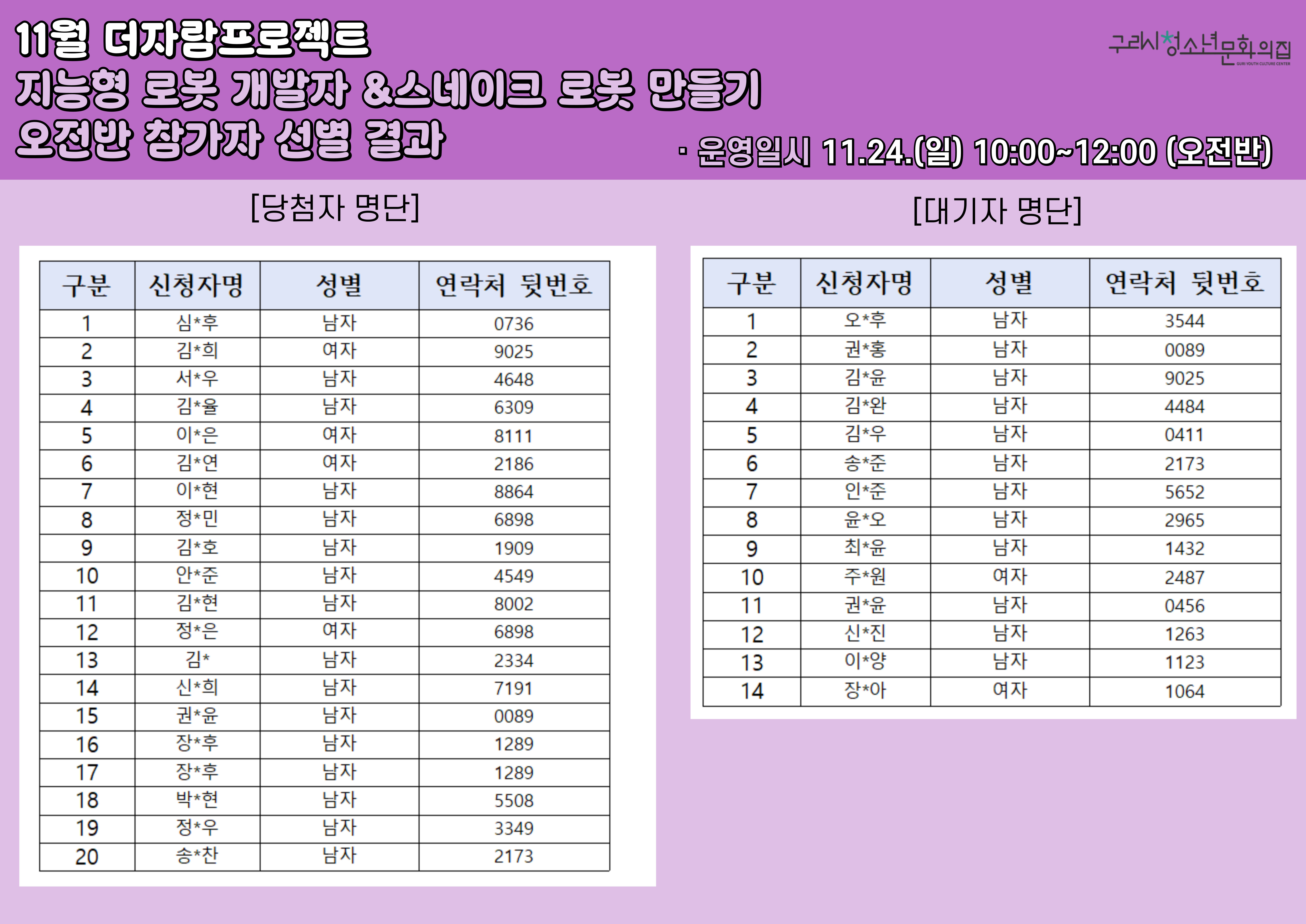 청소년문화의집 더자람프로젝트 지능형로봇개발자 & 스네이크 로봇 만들기 오전반, 오후반 참가자 선정 결과