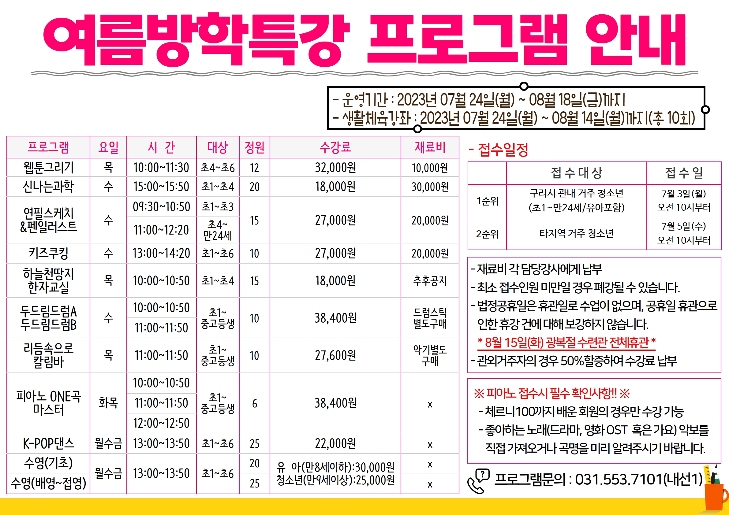 청소년수련관 2023년 여름방학특강 프로그램 안내 작성자 관리자 등록일자 2023년 6월 20일 10시 31분 59초 조회 1,224 - 칼림바 악기 구매 참고 링크 : http://item.gmarket.co.kr/DetailView/Item.asp?goodscode=2846077265&GoodsSale=Y&jaehuid=200001169&NaPm=ct%3Dli2ho800%7Cci%3D00048afe4391140c98eb9981bbc98c92bd2725d2%7Ctr%3Dslsl%7Csn%3D24%7Chk%3D99b1f705c1d36d6719dcc91d1124702109153324 [복사본] 여름방학특강수업장소.jpg [ Size : 1.3MB , Down : 1,148 ] 미리보기 다운로드 목록보기