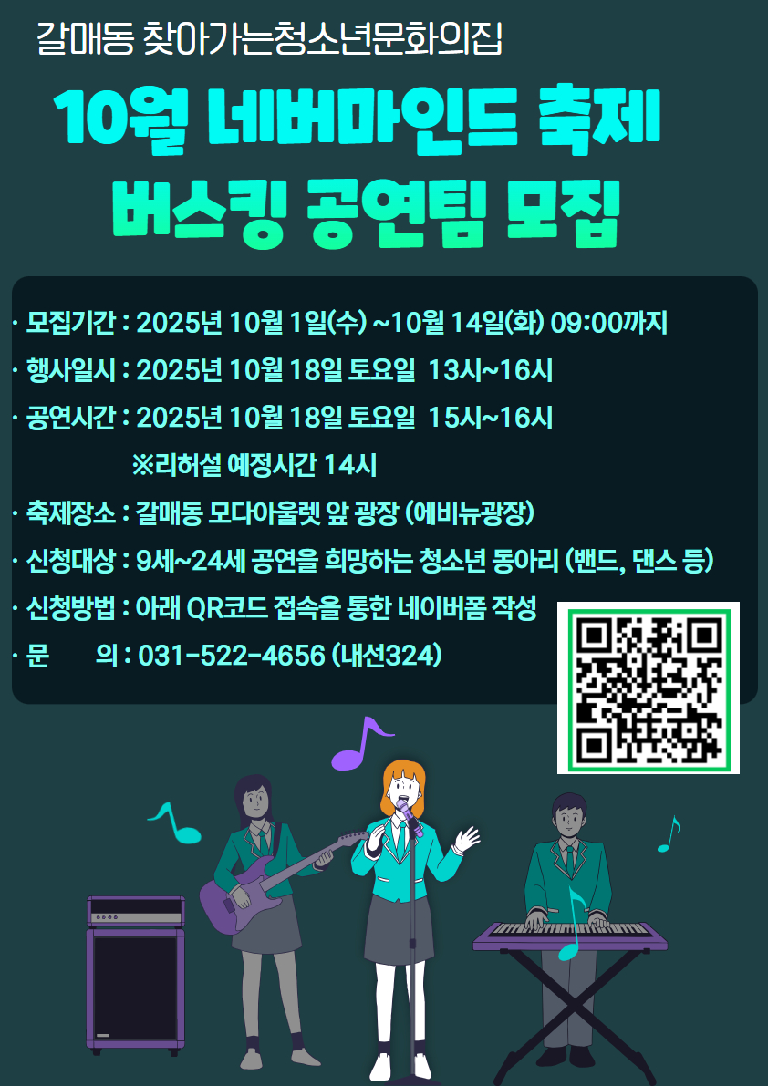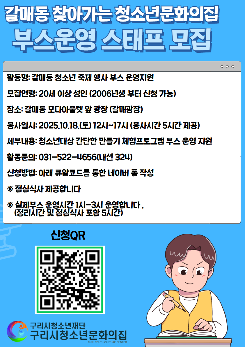 청소년문화의집 [모집] 갈매동 찾아가는 청소년문화의집 - 부스운영 스태프 & 버스킹 공연팀 모집 작성자 이호암 등록일자 2025년 10월 2일 17시 0분 22초 조회 221 봉사자 신청 링크: https://naver.me/G1my5ZZi버스킹팀 모집 링크: https://naver.me/5UTiLd3a 10월 네버마인드 축제 버스킹 공연팀 모집 홍보물.jpg [ Size : 624.82KB , Down : 156 ] 미리보기 다운로드 부스운영 봉사자 모집 홍보.png [ Size : 217.54KB , Down : 161 ] 미리보기 다운로드 목록보기