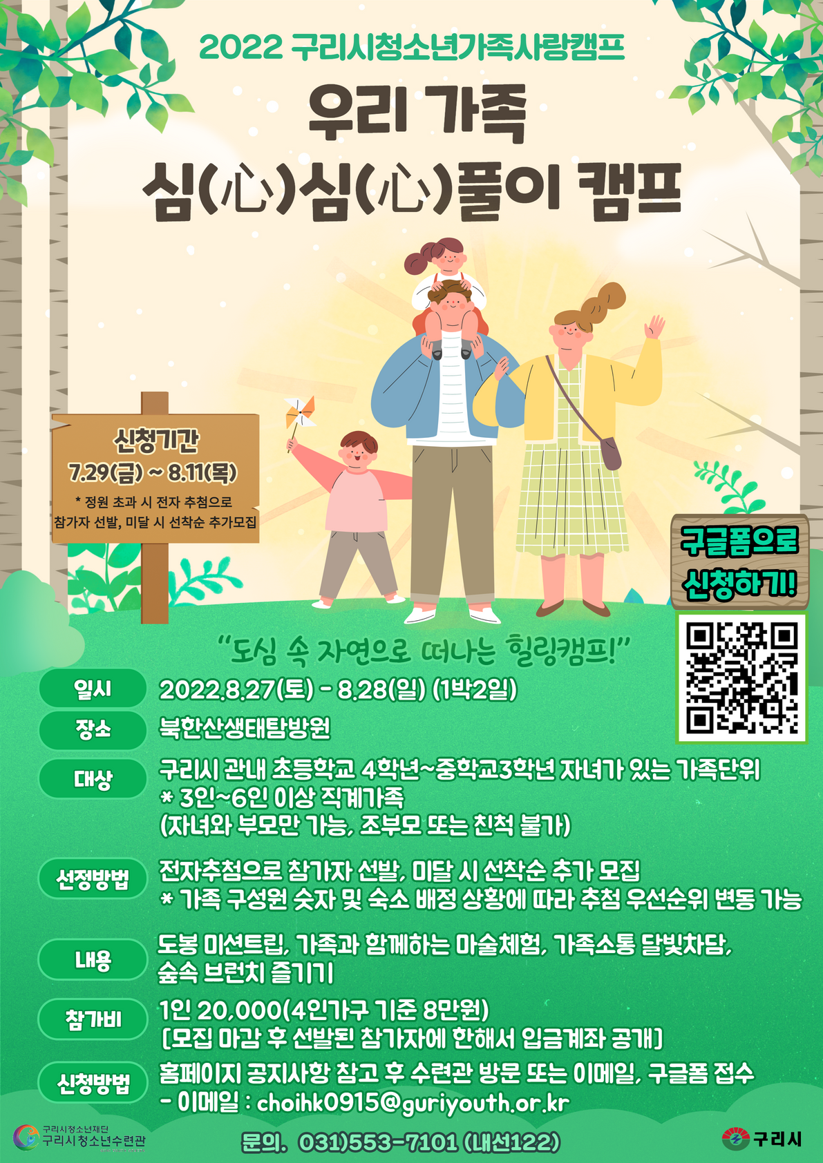 2022 구리시청소년가족사랑캠프 "우리 가족 심(心)심(心)풀이" 참가자 모집이 시작 되었습니다~!