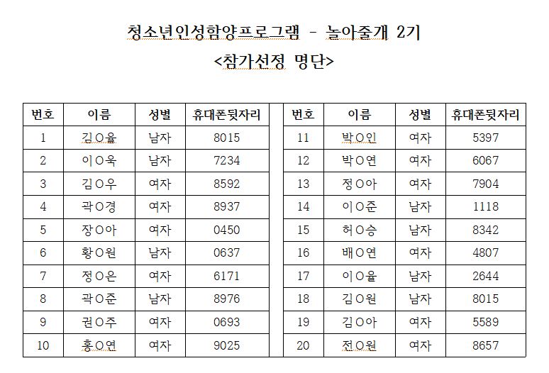 청소년수련관 인성함양프로그램- '놀아줄개 2기' 참가자 선정결과 안내