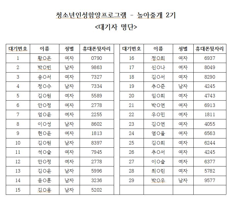 2. 대기자는 참가포기 발생 시 순번대로 개별연락 드리도록 하겠습니다.