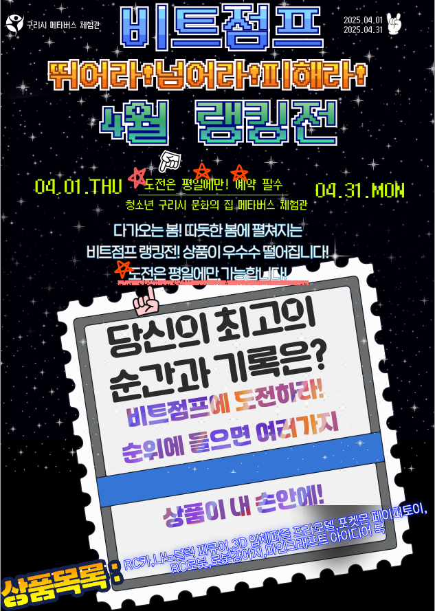 청소년문화의집 [이벤트] 메타버스체험관 AR 비트점프 4월 랭킹전 안내 작성자 권혁준 등록일자 2025년 3월 27일 18시 8분 35초 조회 319 구리시 메타버스체험관 AR 비트점프 4월 랭킹전 실시!메타버스체험관에서 AR 비트점프 4월 랭킹전을 진행합니다!최고의 점수를 기록하고 1등~3등 랭킹 시 소정의 상품도 받아가세요!도전의 기회를 놓치지 마세요! 비트점프.png [ Size : 384.29KB , Down : 239 ] 미리보기 다운로드 목록보기