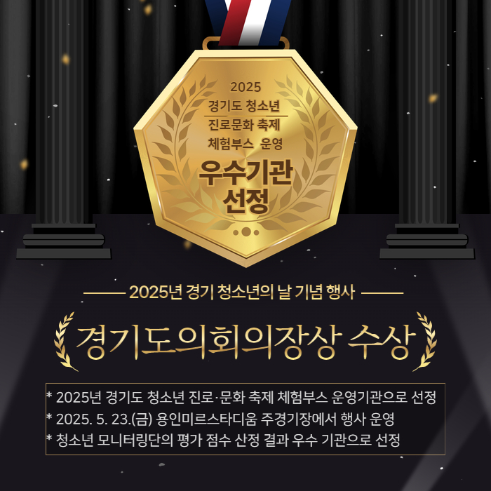 청소년수련관 2025 경기도 청소년 진로문화 축제 체험부스 운영 우수기관 선정(경기도의회의장상 수상) 작성자 조성민 등록일자 2025년 6월 26일 11시 42분 56초 조회 231 250626 - 2025 구리시청소년수련관 경기도의장상 수상.jpg [ Size : 310.89KB , Down : 197 ] 미리보기 다운로드 목록보기