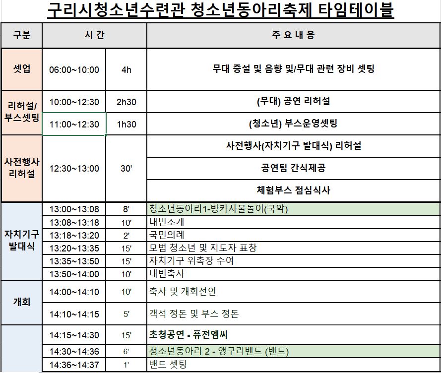 청소년수련관 2024 구리시 청소년의 날 기념 '청소년동아리 축제' 안내도 및 무대 행사 타임테이블