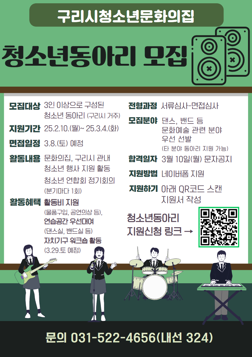 청소년문화의집 [모집] 2025년 구리시청소년문화의집 청소년동아리 모집! 작성자 이호암 등록일자 2025년 2월 10일 17시 19분 33초 조회 453 구리시청소년문화의집과2025년을 함께할청소년 동아리를 모집합니다!신청링크: https://naver.me/GDa6tyDm 청소년동아리 모집 홍보물.jpg [ Size : 650.92KB , Down : 375 ] 미리보기 다운로드 목록보기