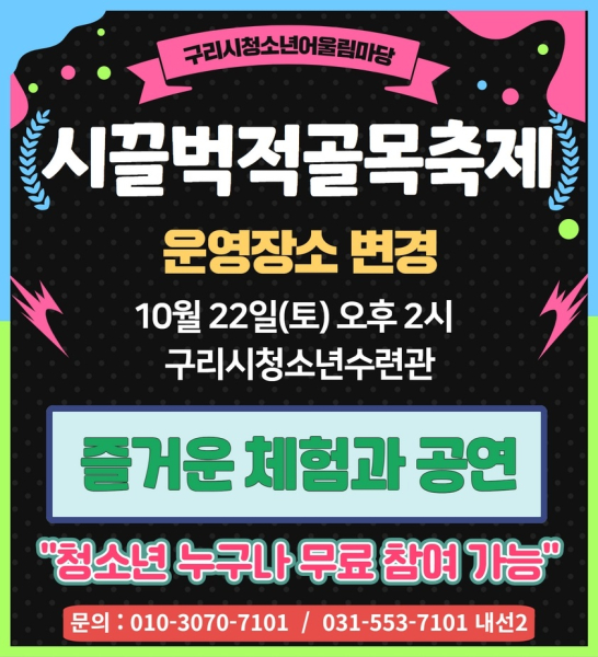 청소년수련관 [장소변경] 시끌벅적골목축제 운영장소 변경 안내 작성자 관리자 등록일자 2022년 10월 20일 10시 39분 26초 조회 687 2022 구리시청소년어울림마당 "시끌벅적골목축제"축제 운영장소가 변경되어 안내드립니다.구리광장 -> 구리시청소년수련관 일정은 그대로 장소만 변경되었습니다.따뜻하고 편안한 수련관 내부와 공연장에서 즐거운 축제를 즐겨주세요~ 수정됨_시골축제 홍보 장소변경안내.jpg [ Size : 314.92KB , Down : 506 ] 미리보기 다운로드 목록보기