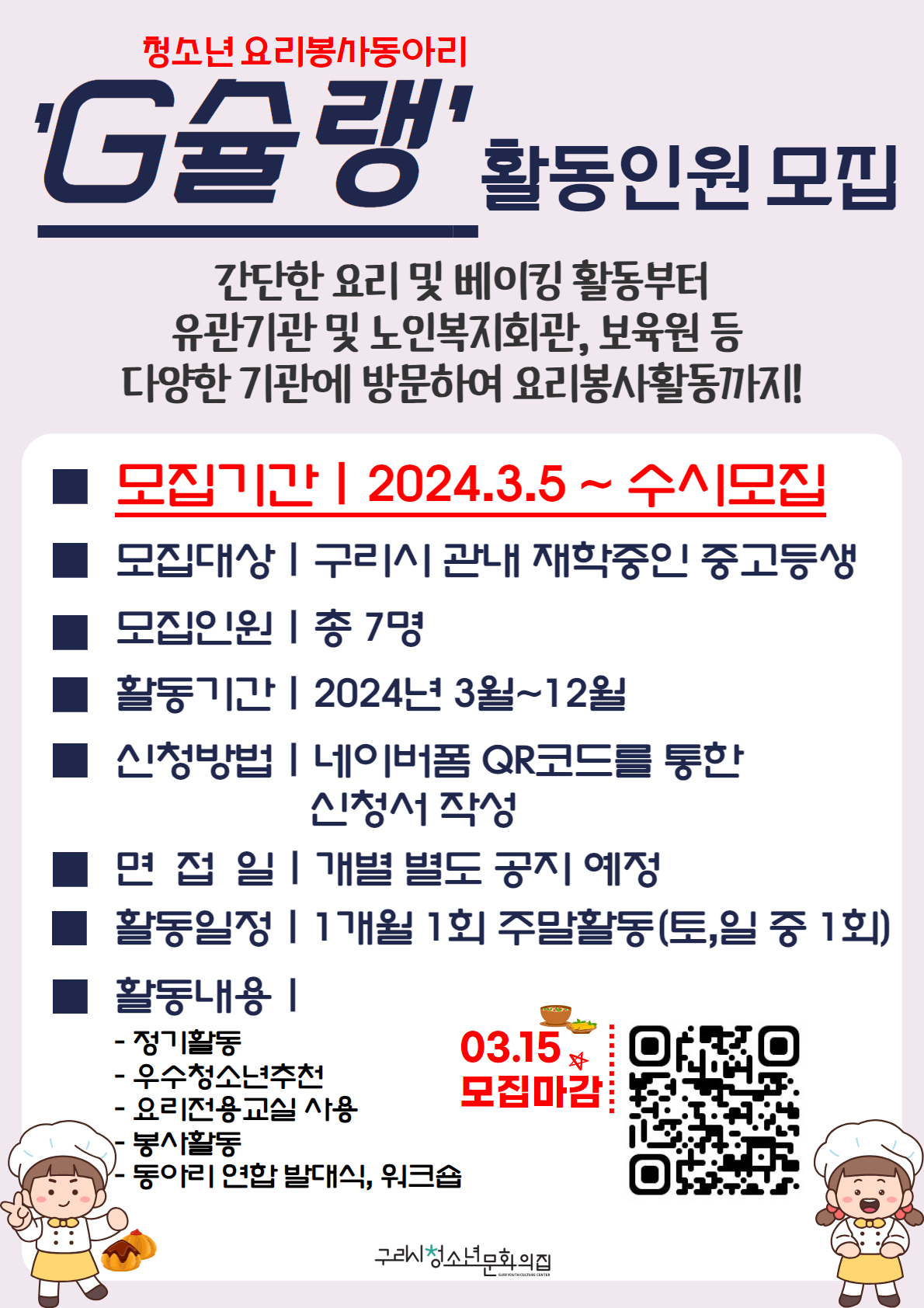 청소년문화의집 구리시청소년문화의집 요리봉사동아리 'G슐랭' 활동인원 모집
