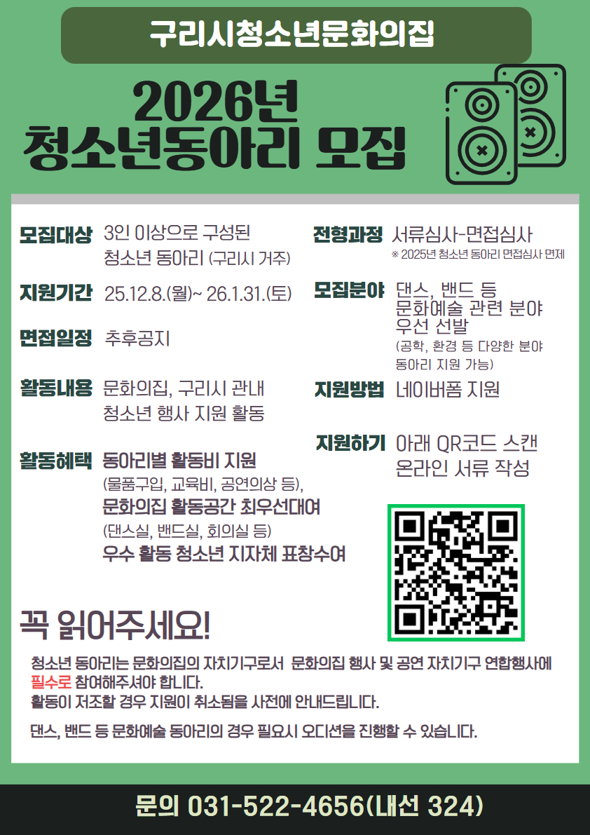 공지 청소년문화의집 2026년 구리시청소년문화의집 청소년동아리 모집 작성자 이호암 등록일자 2025년 12월 11일 14시 6분 57초 조회 64 제목을 입력하세요 (29).jpg [ Size : 682.54KB , Down : 70 ] 미리보기 다운로드 목록보기