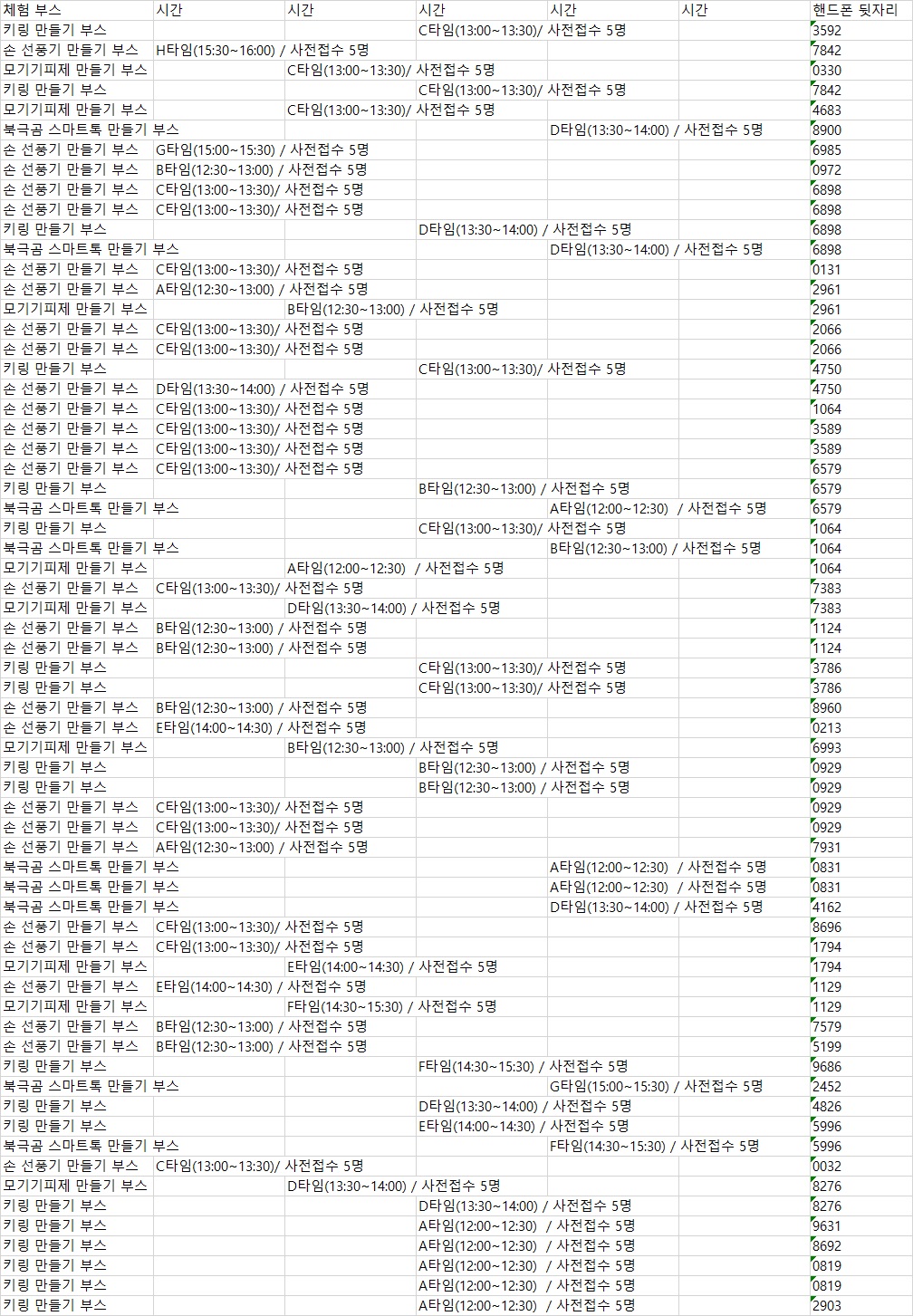 청소년문화의집 [공지] 더드림 유스페스티벌 체험부스 시청 시간 안내 작성자 김진수 등록일자 2024년 8월 2일 15시 16분 59초 조회 469 안녕하세요 구리시청소년문화의집입니다! 더드림 유스페스티벌 체험 신청시간을 아래와 같이 알려드립니다아래 파일 첨부를 파일을 확인하시고핸드폰 뒷자리로 신청 시간을 확인할 수 있습니다 그림판(23).jpg [ Size : 639.98KB , Down : 381 ] 미리보기 다운로드 목록보기