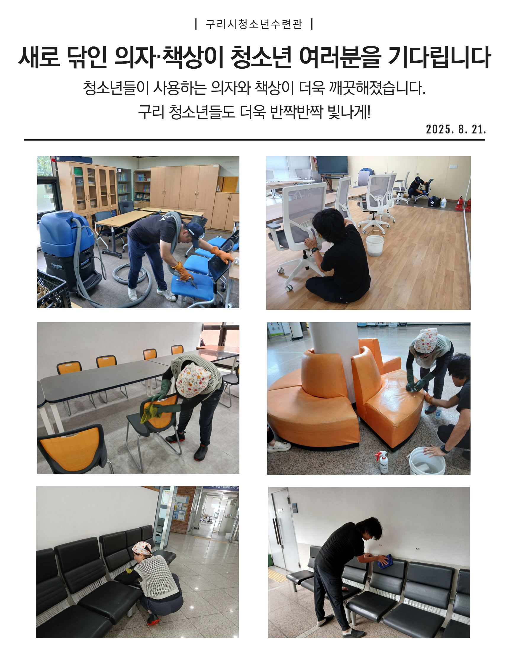청소년수련관 구리시청소년수련관에서 더 깨끗해진 의자와 책상이 여러분을 기다립니다. 작성자 문서정 등록일자 2025년 8월 22일 11시 0분 49초 조회 292 의자 청소 홍보.jpg [ Size : 2.34MB , Down : 232 ] 미리보기 다운로드 목록보기