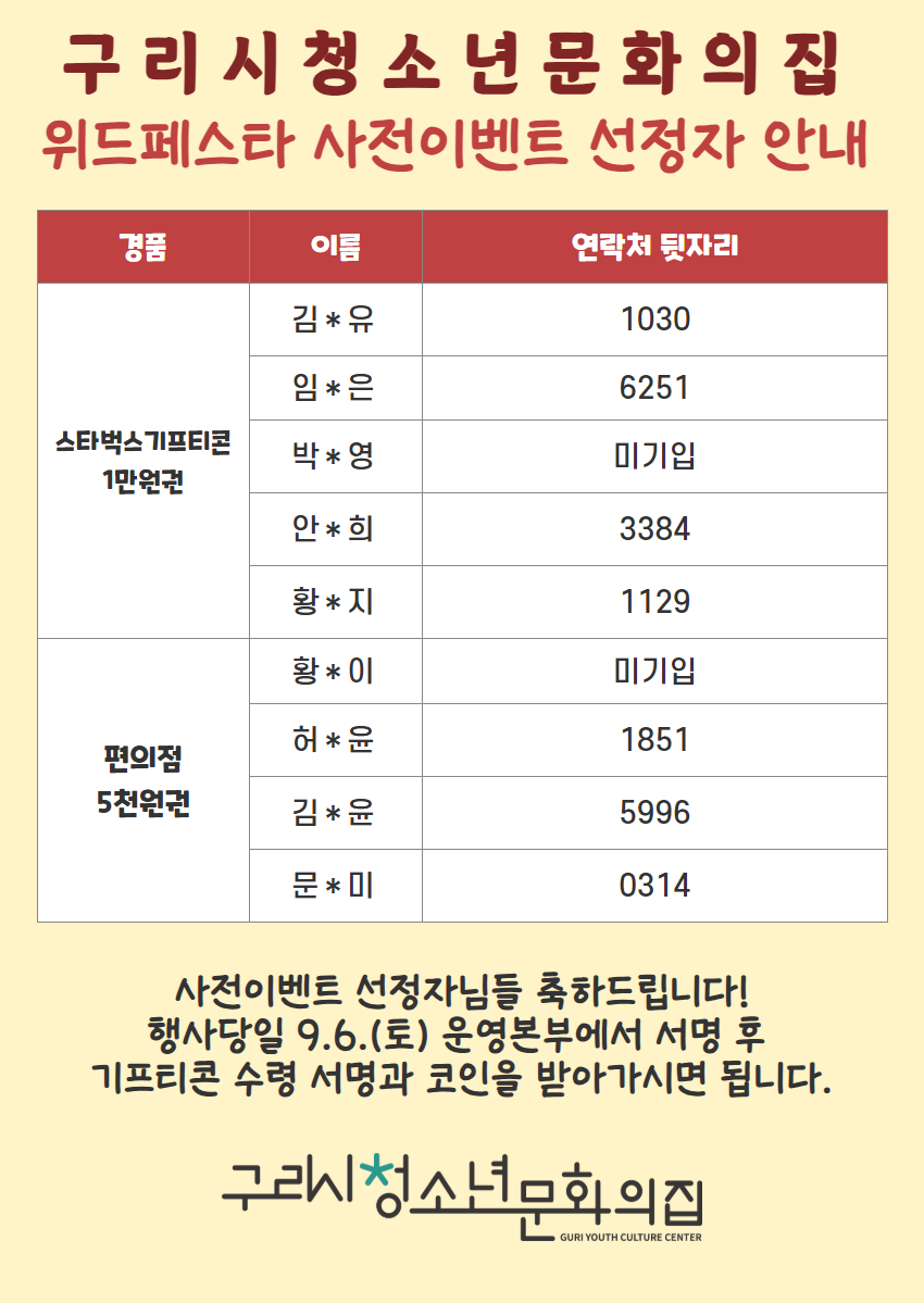 청소년문화의집 [대학생서포터즈 드림터즈가 쏜다!] 위드페스타 사전이벤트 선정자 공지 작성자 이호암 등록일자 2025년 9월 5일 14시 20분 59초 조회 147 [구리시청소년문화의집 대학생서포터즈 드림터즈가 쏜다]선정자분들 모두 축하드리며행사당일 9.6.(토) 운영본부에서 기프티콘 수령 서명과코인 받아가시길 바랍니다! 감사합니다 [복사본] 제목을 입력하세요 1.png [ Size : 105.12KB , Down : 131 ] 미리보기 다운로드 목록보기