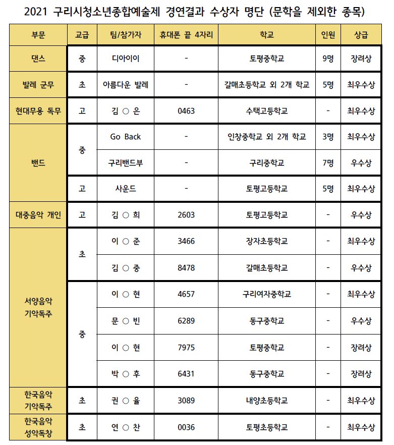 청소년수련관 2021 청소년종합예술제 문학 제외 종목 심사결과 작성자 관리자 등록일자 2021년 8월 11일 15시 1분 24초 조회 945 참가한 모든 청소년 여러분 수고하셨습니다.10월에 있는 경기도 본선 참가 대상에게는 개별적으로 전화연락드릴 예정입니다. 문학 제외 종목.PNG [ Size : 113.57KB , Down : 719 ] 미리보기 다운로드 목록보기