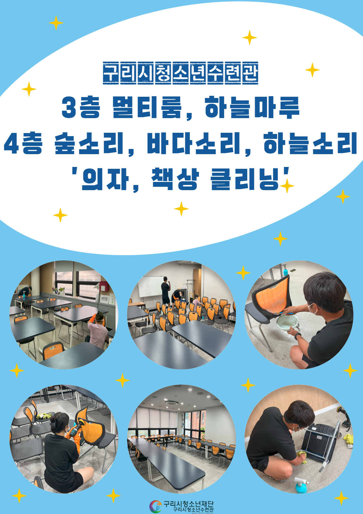 청소년수련관 구리시청소년수련관 3층 멀티룸, 4층 숲소리, 하늘소리, 바다소리 의자, 책상 클리닝 작업 진행