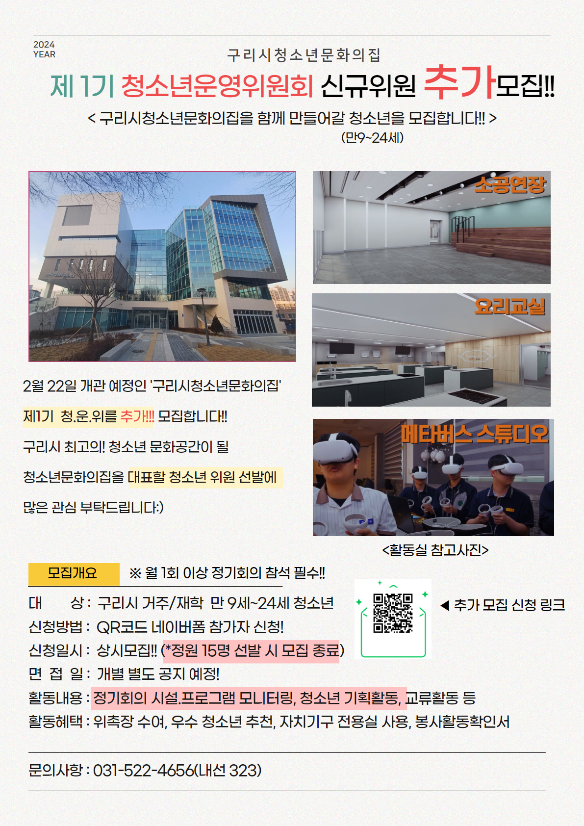 청소년문화의집 (모집) 구리시청소년문화의집'제1기 청소년운영위원회' 모집 작성자 김진수 등록일자 2024년 2월 26일 11시 18분 20초 조회 514 참가 신청 링크: https://m.site.naver.com/1j67W 에서 신청서 작성하시면 됩니다!!기타 사항은 포스터를 참고해주세요! 청운위 추가 모집 포스터(최종).jpg [ Size : 2.92MB , Down : 191 ] 미리보기 다운로드 목록보기