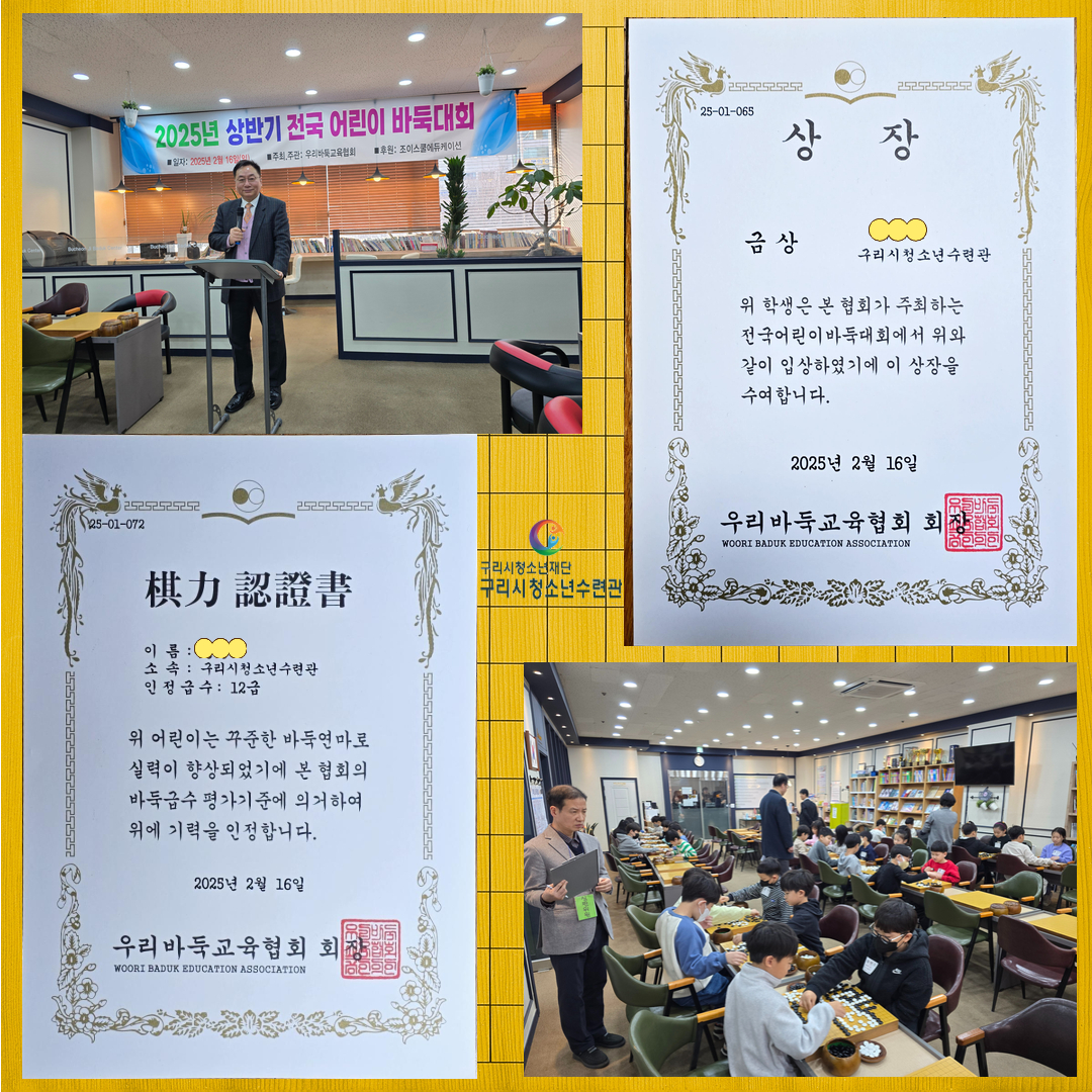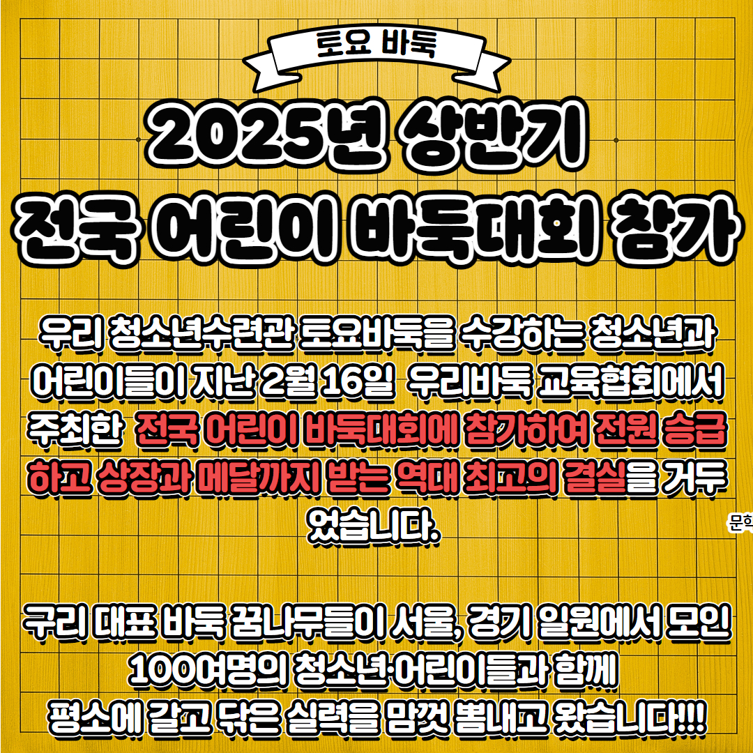 청소년수련관 2025년 상반기 전국 어린이 바둑대회에 참가한 바둑교실 청소년 전원 승급 및 수상 소식을 전합니다! 작성자 문신자 등록일자 2025년 2월 25일 15시 40분 42초 조회 502 바둑교실 대회 홍보 1.jpg [ Size : 1.28MB , Down : 351 ] 미리보기 다운로드 바둑교실 대회 홍보 3.jpg [ Size : 1.49MB , Down : 346 ] 미리보기 다운로드 바둑교실 대회 홍보 (1).jpg [ Size : 1.9MB , Down : 356 ] 미리보기 다운로드 목록보기