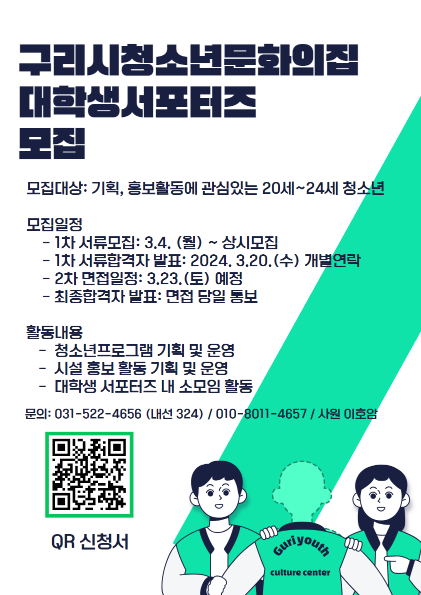 청소년문화의집 구리시청소년문화의집 대학생서포터즈 모집(모집기간 연장) 작성자 김윤지 등록일자 2024년 3월 6일 16시 8분 13초 조회 498 대학생 서포터즈 홍보물 (모집기간 연장).jpg [ Size : 535.06KB , Down : 399 ] 미리보기 다운로드 목록보기