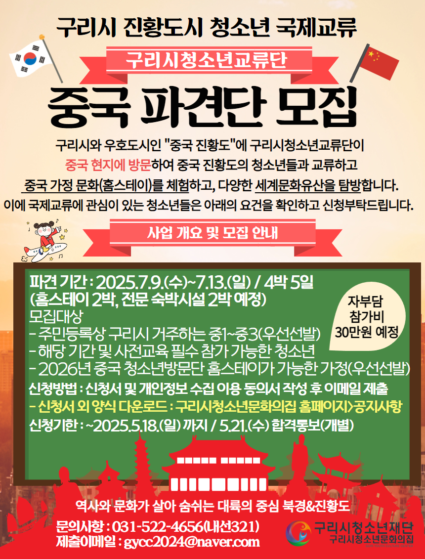 청소년문화의집 [중국교류파견단모집] 구리시 진황도시 청소년국제교류 파견 청소년 모집(~5/18까지)