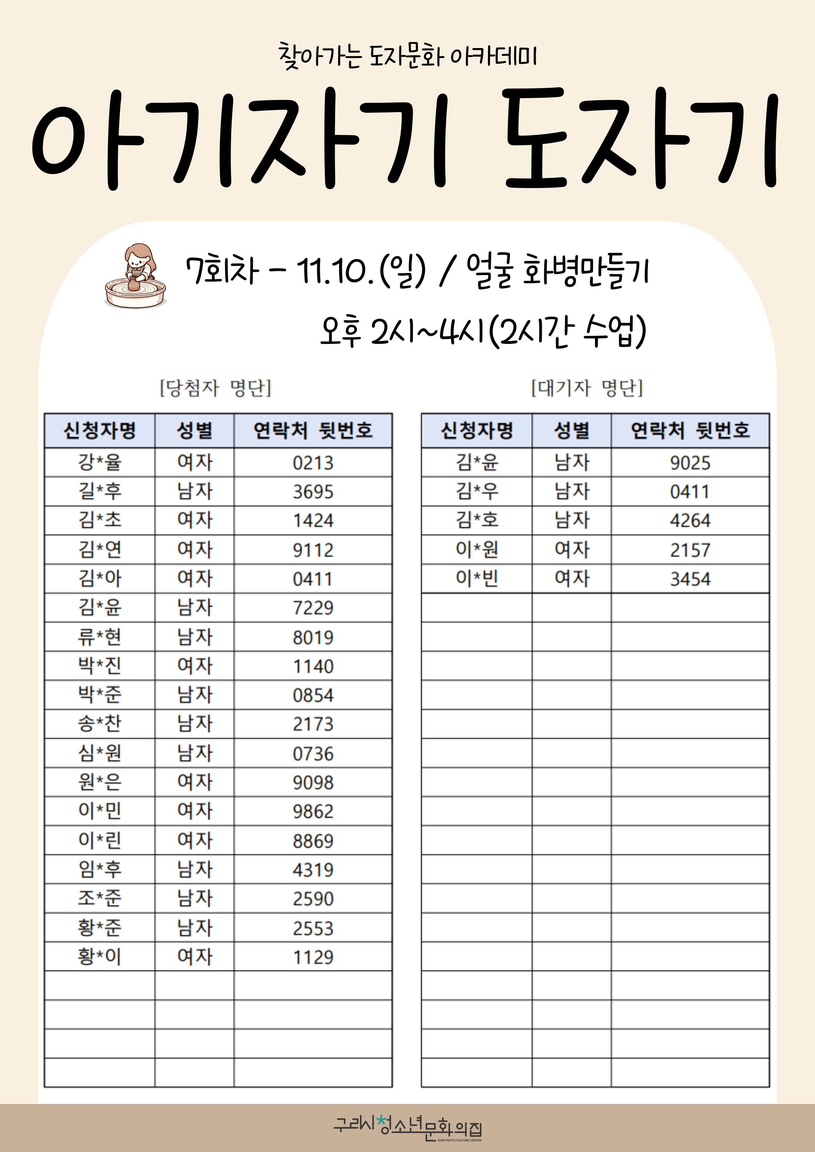 청소년문화의집 도자 체험 프로그램 '아기자기 도자기' 7회차 참가자 선정결과