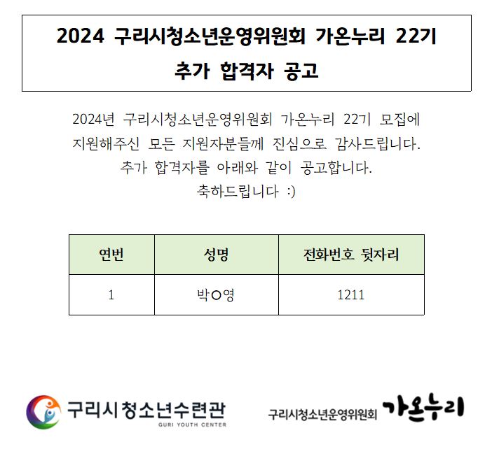 청소년수련관 구리시청소년운영위원회 가온누리 22기 추가합격자 공고 작성자 김재희 등록일자 2024년 4월 9일 8시 59분 48초 조회 349 추가 합격자 공고.JPG [ Size : 53.5KB , Down : 218 ] 미리보기 다운로드 목록보기