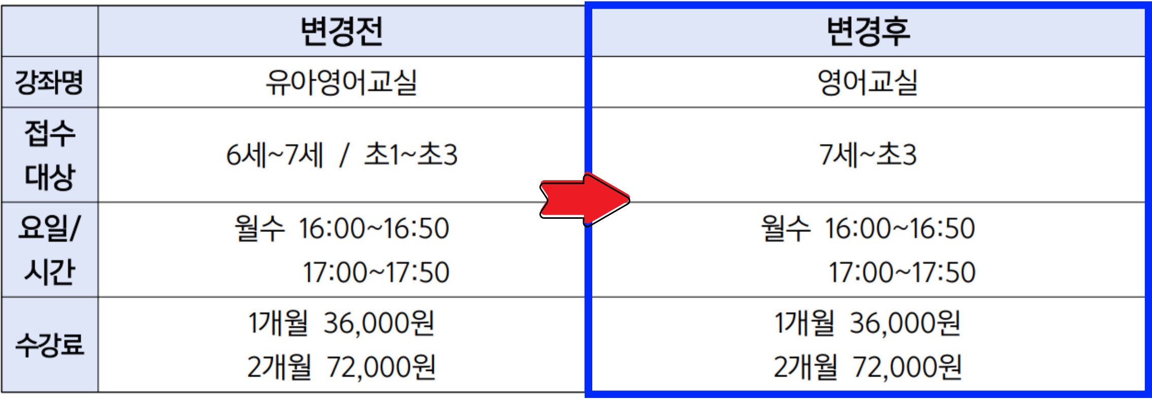청소년문화의집 청소년문화의집 영어교실 운영 안내 작성자 김윤지 등록일자 2024년 10월 23일 11시 30분 4초 조회 774 구리시청소년문화의집 영어교실 운영 안내기존 모집 안내에서 변경사항이 있어 아래와 같이 안내드리니 접수에 참고하시기 바랍니다。 팝업-003 (1).jpg [ Size : 190.84KB , Down : 577 ] 미리보기 다운로드 영어교실-001 (1).jpg [ Size : 571.61KB , Down : 161 ] 미리보기 다운로드 목록보기