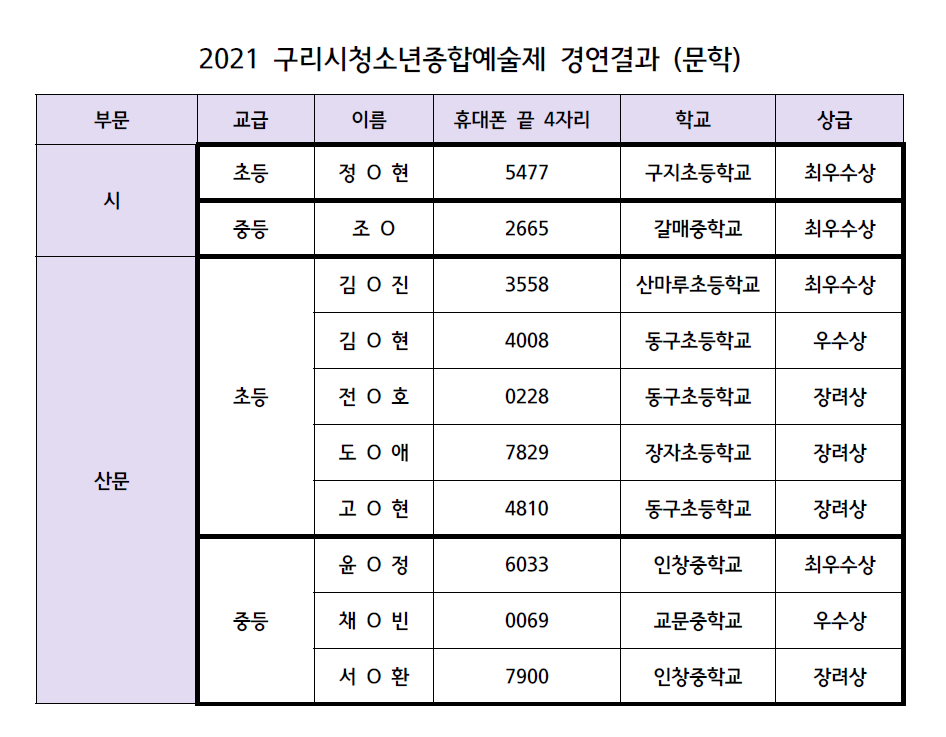 청소년수련관 2021 청소년종합예술제 문학경연 심사결과 작성자 관리자 등록일자 2021년 8월 9일 15시 53분 17초 조회 839 참가한 모든 청소년 여러분 수고하셨습니다.10월에 있는 경기도 본선 참가 대상에게는 개별적으로 전화연락드릴 예정입니다. 문학.PNG [ Size : 81.44KB , Down : 476 ] 미리보기 다운로드 목록보기