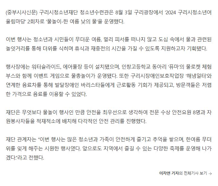 청소년수련관 구리시청소년재단 청소년수련관 '물놀이-한 여름 낮의 물' 운영(중부시사신문 외 8곳) 작성자 조성민 등록일자 2024년 8월 7일 16시 58분 54초 조회 325 1.JPG [ Size : 97.56KB , Down : 205 ] 미리보기 다운로드 2.JPG [ Size : 80.57KB , Down : 203 ] 미리보기 다운로드 목록보기