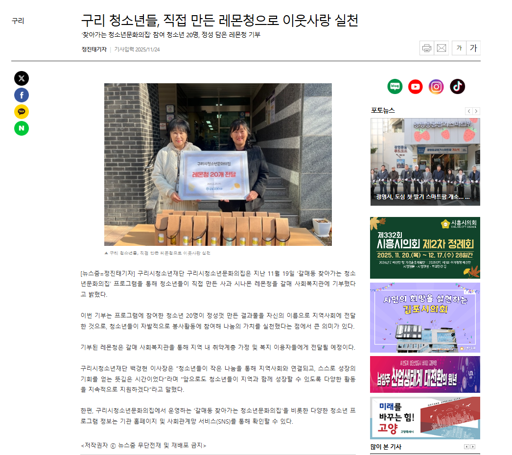 청소년문화의집 구리 청소년들, 직접 만든 레몬청으로 이웃사랑 실천 (중부시사신문 외 6곳) 작성자 이호암 등록일자 2025년 11월 25일 16시 50분 21초 조회 38 보도자료 전달식.png [ Size : 605.52KB , Down : 22 ] 미리보기 다운로드 목록보기