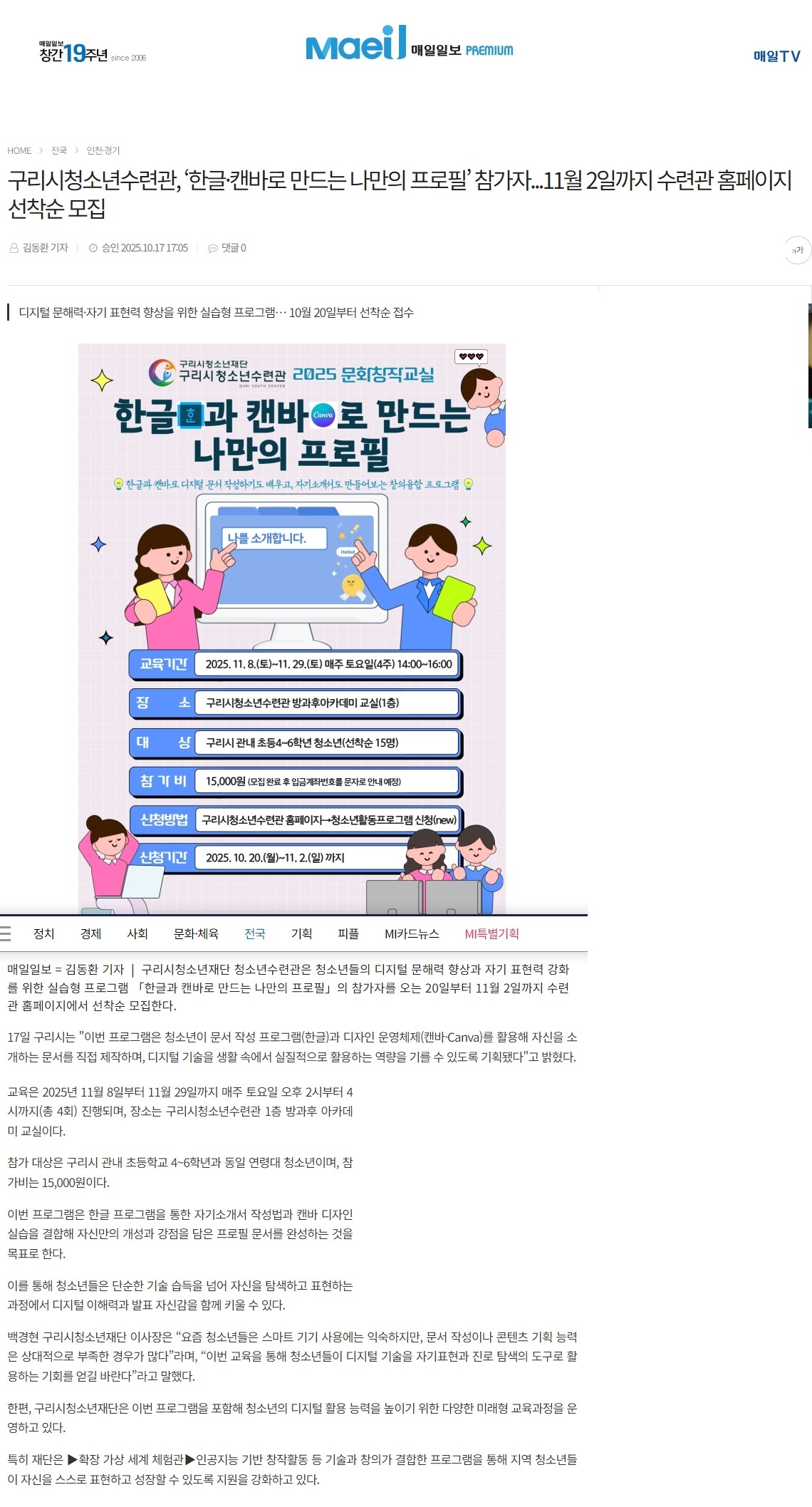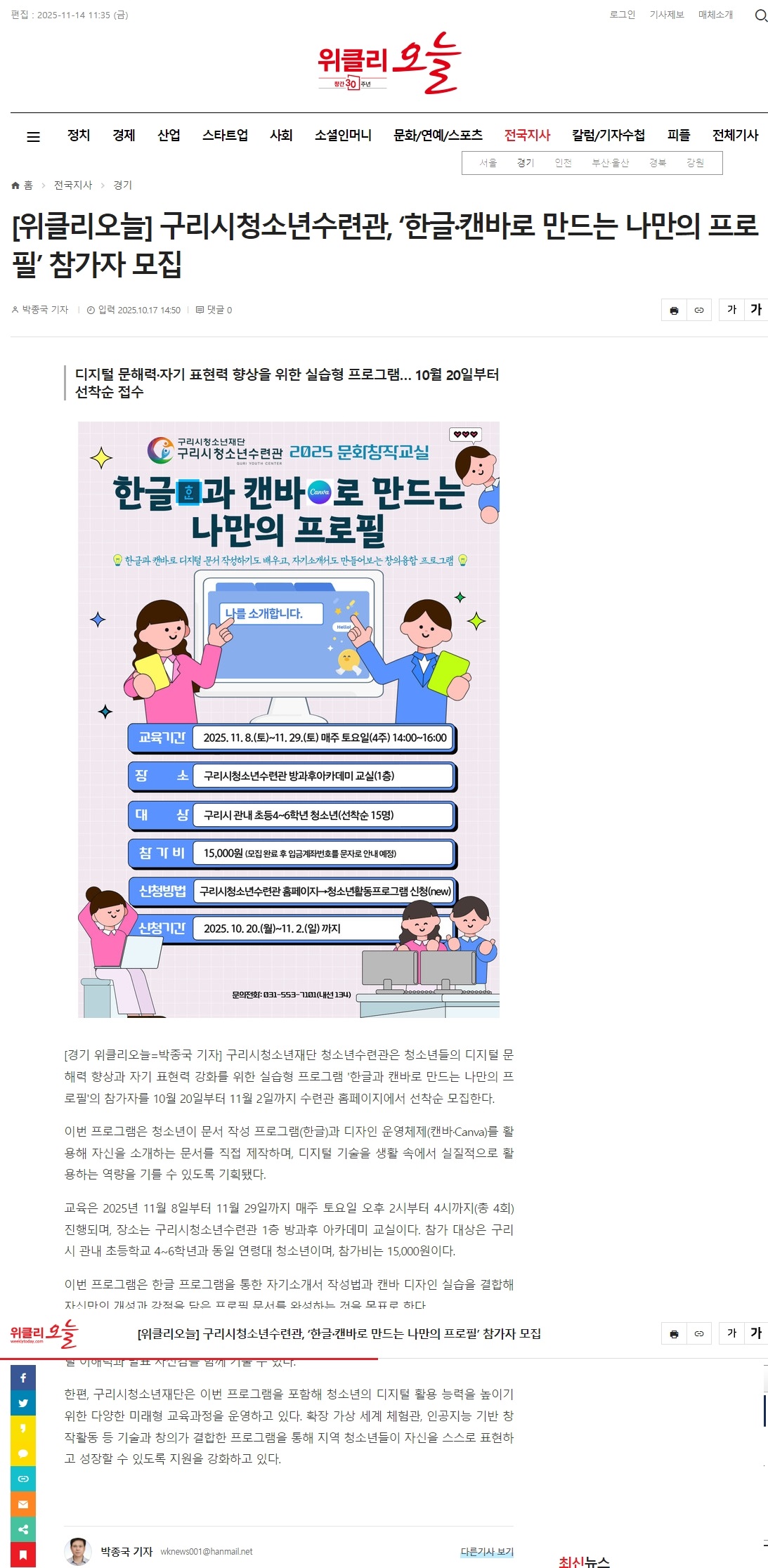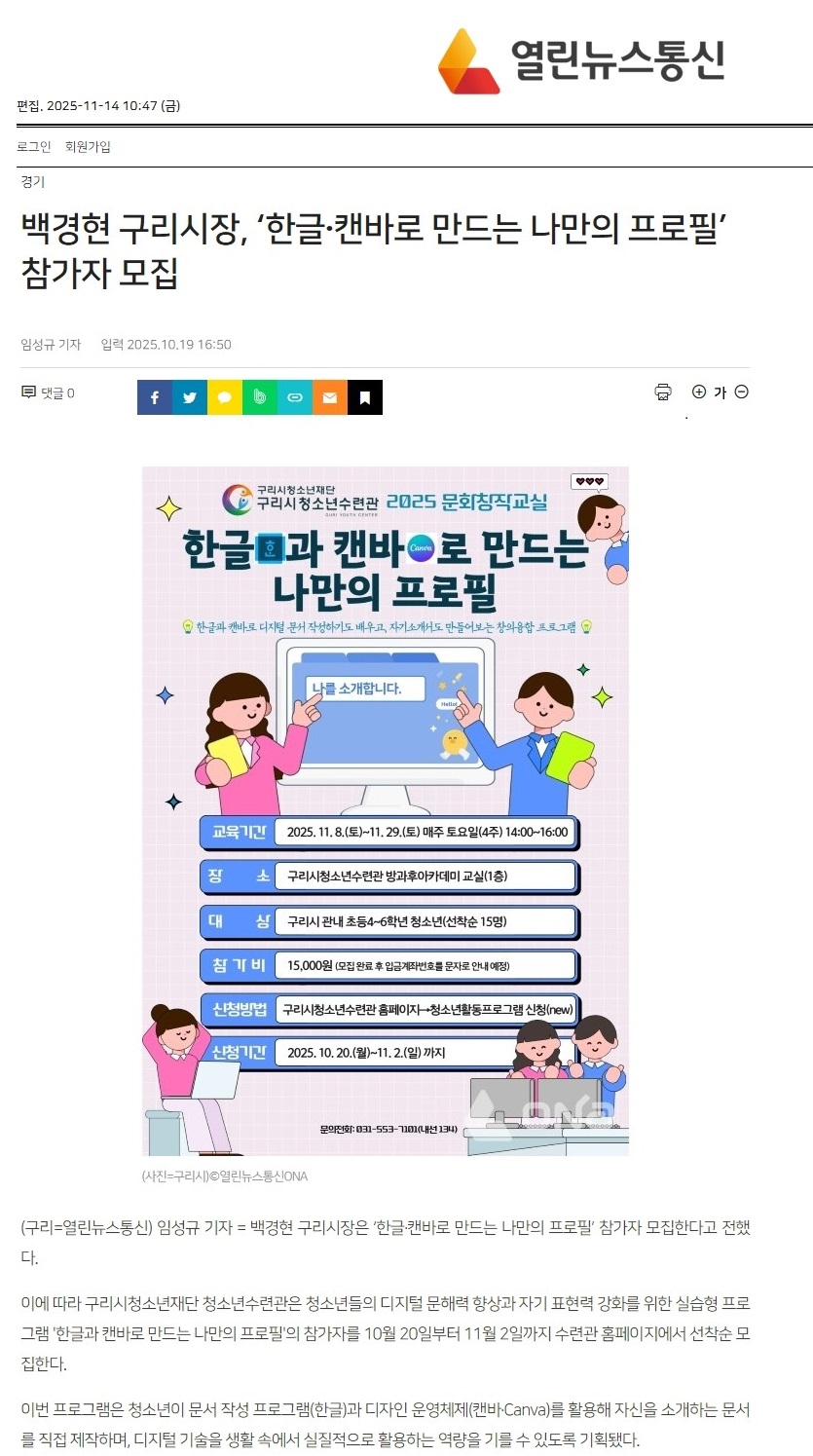 청소년수련관 구리시청소년재단 청소년수련관, '한글과 캔바로 만드는 나만의 프로필' 프로그램 참가자 모집(매일일보 등 5곳) 작성자 문서정 등록일자 2025년 11월 14일 11시 49분 33초 조회 47 위클리오늘.jpg [ Size : 489.08KB , Down : 29 ] 미리보기 다운로드 열린뉴스통신.jpg [ Size : 276.48KB , Down : 27 ] 미리보기 다운로드 매일일보.jpg [ Size : 452.69KB , Down : 22 ] 미리보기 다운로드 목록보기